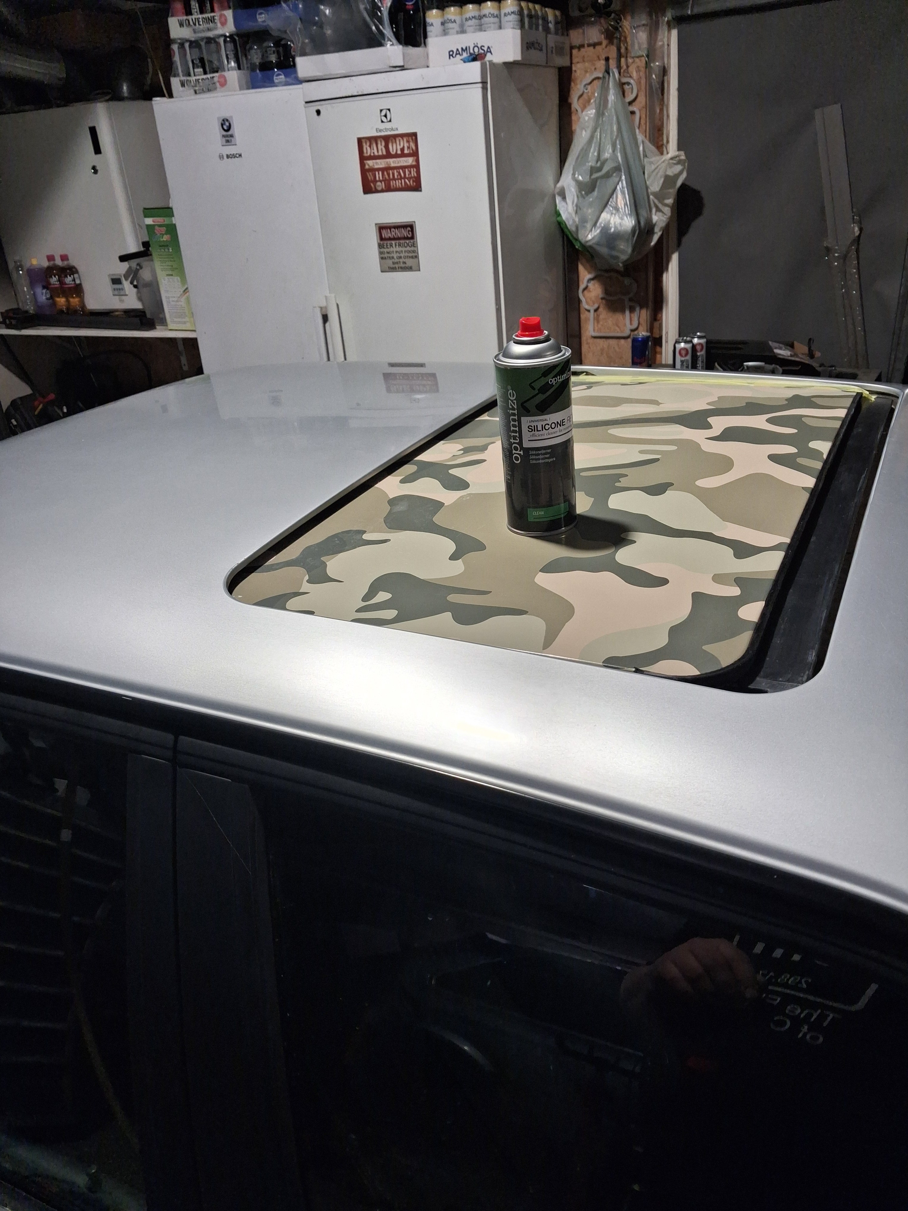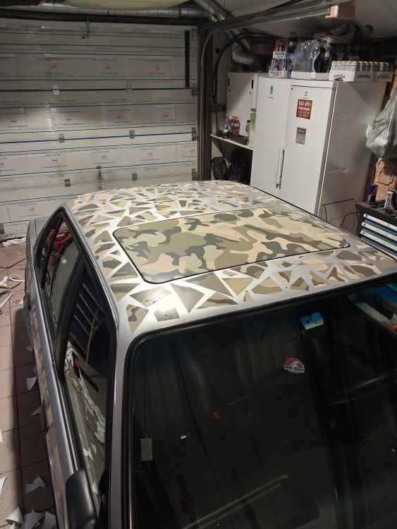 Dagens økt, Begynte med å vaske lakken med sillikonfjerner. Bare eksperimenterer litt med folie 😆 Ble da vel ikke helt håpløst 🤔 Taket har noen merker og er stygg i lakken så ble litt delt opp cammo på det, samme som jeg hadde på en L200 jeg hadde. Orginalpoliti kan bare se en annen vei 😅, verdens enkleste fjerne heldigvis, Tak skal lakkes etterhvert når jeg føler for det.mulig jeg fjerner takluken i prosessen også. Takstativet skal nok på igjen, men mulig men noe annet enn ølkasse i år, fattern hadde noe greier på loftet 🤔🤔 Avslutningen på dører og front må jeg feste imorra når vannet er borte. Elendig kvalitet på folien her altså 😅,