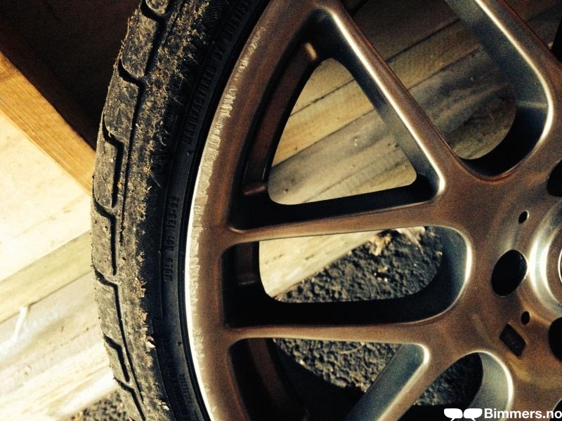 Bilde av siste felgen som har noen kantkjørings -merker hvor også dekket er pungtert.