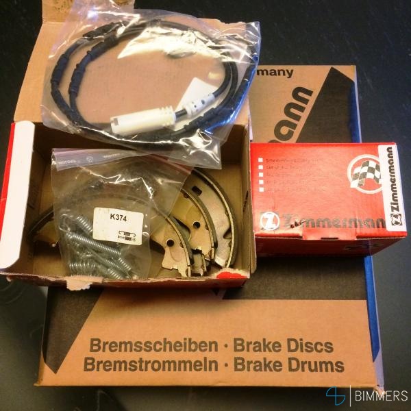 Bremser av typen Zimmermann - skiver, klosser, slitasjevarsler og håndbremssko med tilbehør.