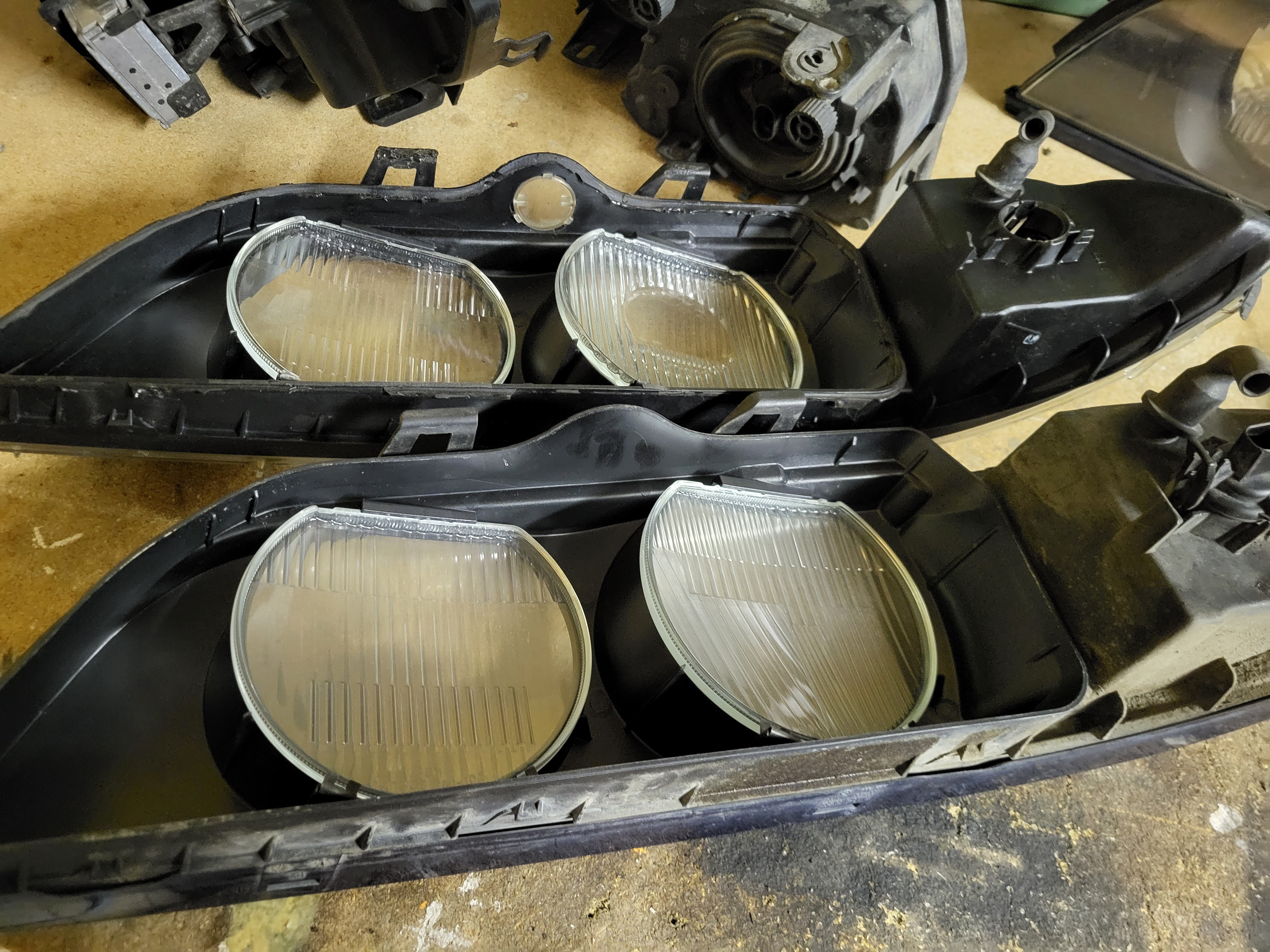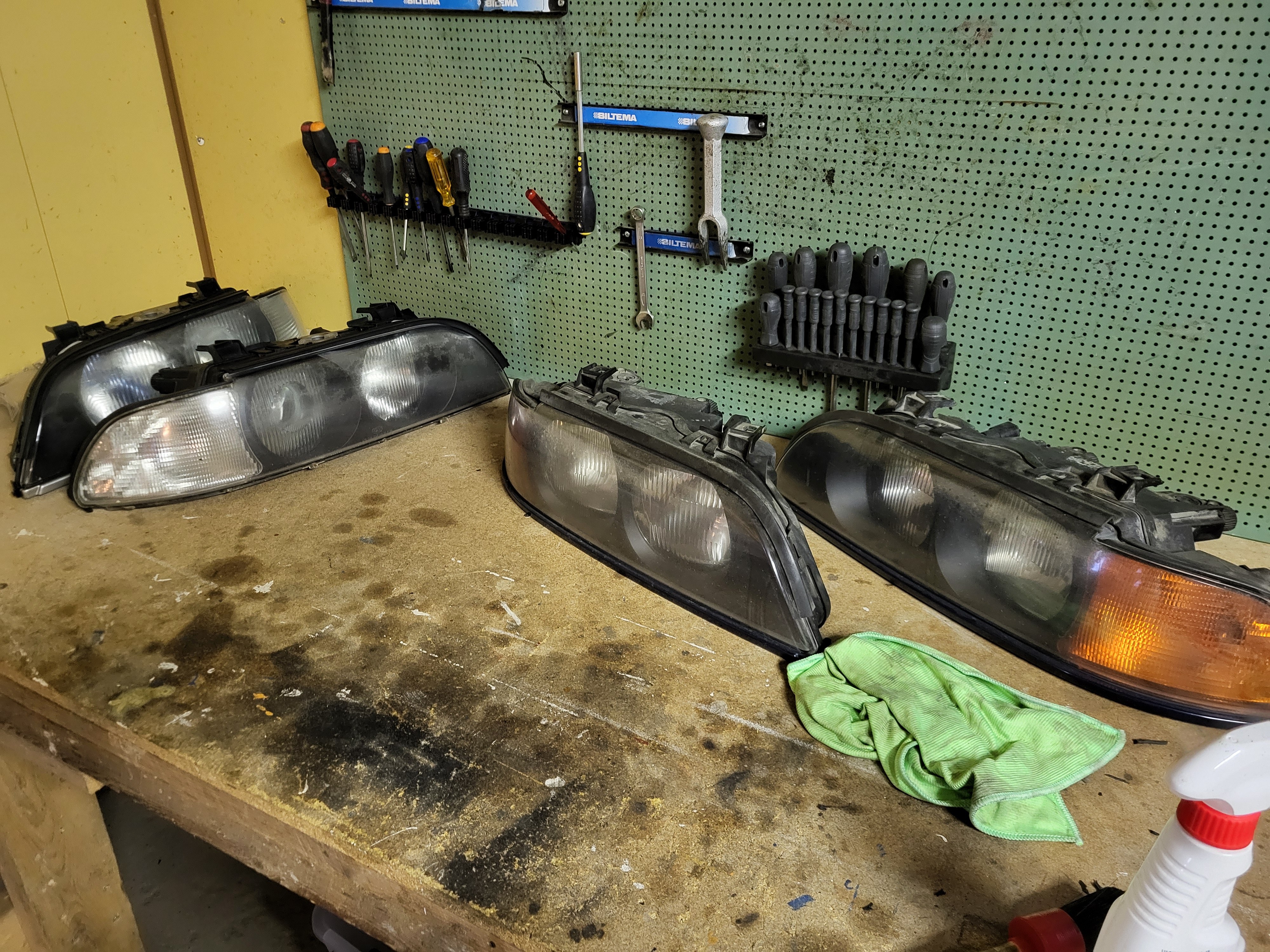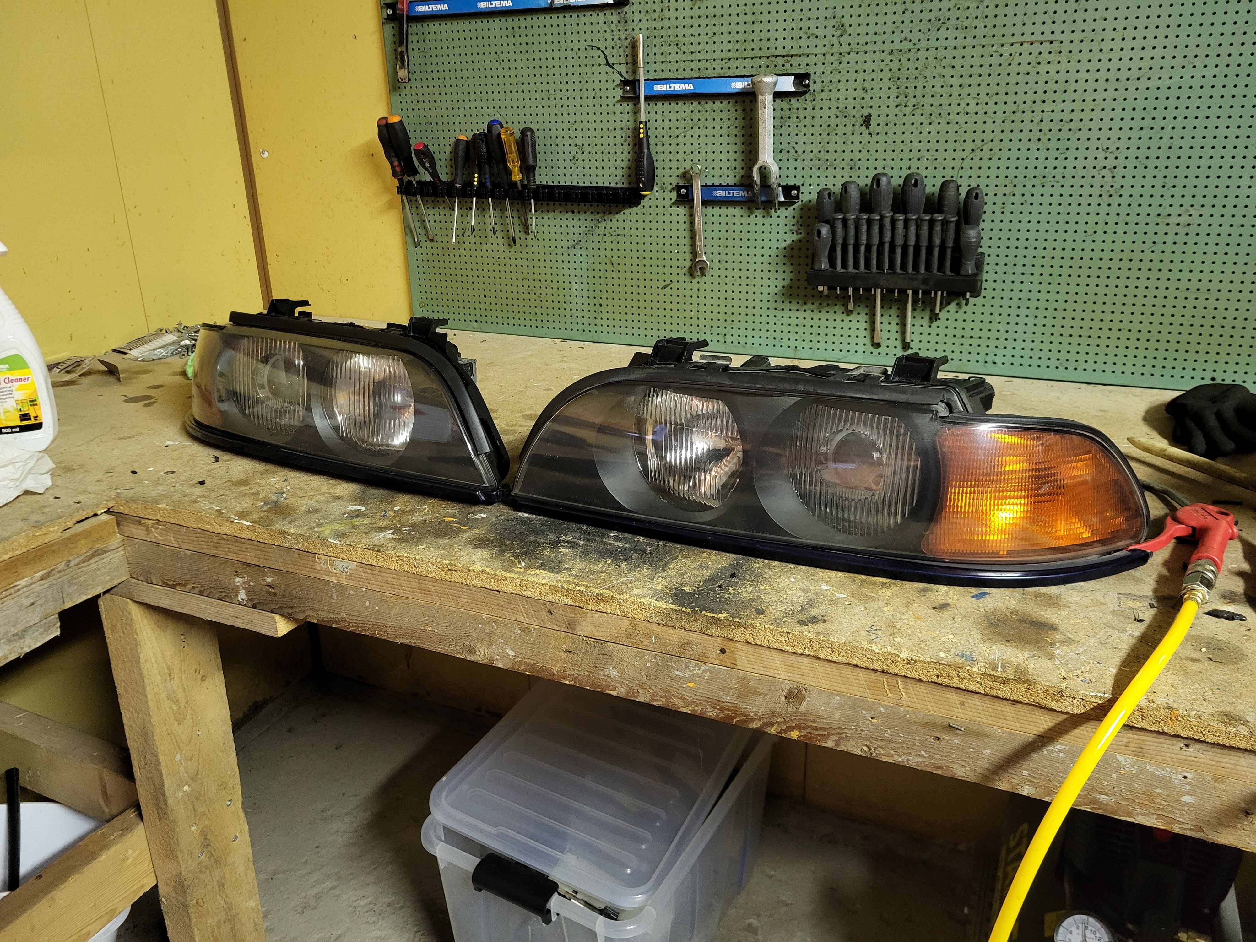 Vegard_ Skrevet 5 timer siden Forfatter Skrevet 5 timer siden Retrofitbonanza del 1: Xenon hovedlykter med auto LWR Det finnes et par måter å montere xenon på disse bilene, der det enkleste er å bare montere xenonlyktene og beholde manuell justering. Dette er vel teknisk sett ikke "lov" og man kan vel få en feil på PKK slik. Den neste metoden er å montere auto LWR modulen i følge av offisielle BMW retrofit papirer hvor man beholder originale lysmodulen. Da slipper man å skaffe ny lysmodul og kode den. Her så bypasser man justeringshjulet ved siden av instrumentpanelet, da går auto LWR modulen sin output til input (fra justeringshjul) på lysmodul som da går ut til justeringsmotorene på lyktene. På siste metoden så er det som om bilen kom med xenon fra fabrikk, da trenger man ny LCM, koding og auto LWR modulen. Da sender LCM kun signal til Auto LWR modulen som går direkte til justeringsmotorene på lyktene, og ikke gjennom LCM som forige metode. I og med at jeg skal ha autolys og RLS (Regn og Lys Sensor) så må jeg ha en nyere lysmodul, da måtte jeg gå for siste måten, men det er jo enkelt når man hadde en hel delebil på lager. Ledningsnett og sensorer fra delebil Jeg måtte også plukke litt fra en delebil, da det er noe forskjell mellom sedan og stasjonsvogn bak. Svingarmen på xenon biler har festepunkt for staget til bakre nivåsensor, svingarmen på halogenbiler har ikke. Her henta jeg også et sett med xenon preface lykter. Vasket og klar til montering, foringene her er OK. Lyktene var i dårlig stand, men det gjør ingenting når man har ett bra sett fra før, men disse var halogen så det krevde en del ombygging. De er veldig modulære så det var jo ikke noe problem, justeringspinnene var også perfekte i halogenlykte som originalt stod på bilen. Her ser man forskjellen på halogen og xenon glass. Xenon har en ekstra prisme(?) på nærlyset Ferdig satt sammen, polert glass og i perfekt stand med nye xenonpærer. Montert på bil (før polering) LWR modul på plass, så begynne med ledningsnett. Her går det ledninger mange steder, utrolig nok. Frem til ABS modul, her trakk jeg også en ekstra kabel til navigasjonsretrofitt. Pin 27 på LCM Det var også en del ledninger som gikk til diverse hubs/koblingsbusser under dash, men det fant jeg ikke noen gode bilder av. Jeg sendte alt av ledninger gjennom et tidligere hull laget til for tidligere DEFA kabinvarmer, og motorvarmer. For ledningene til nivåsensorene så fulgte jeg retrofit papirene til BMW, da jeg kunne bruke hull som allerede eksisterte her, og ikke trengte å borre nye hull lenger bak. Til sensoren bak så fulgte jeg bremserørene langs gulvet, og så opp ved bensintanken og inn til sensor. Her er også faktisk bakre travers annerledes mellom xenon og halogen bil. Xenonbiler har en "nippel" for braketten til sensoren, men her brukte jeg bare 2 bolter og muttere. Dette fungerer utmerket. Nye stag framme og bak fra BMW ble sevfølgelig montert og klipset fast. For å kode LCM så prøvde jeg meg på NCSexpert og NCSdummy, men det fikk jeg ikke til å fungere, så da ble det til at jeg bestilte PAsoft/BMW Scanner 1.4 med dongle. For å få dette til å fungere så ble det til at jeg satt opp windows xp på en VM. Det var ikke bare bare det heller, masse feilmeldinger og masse reinstalleringer. Men når jeg først fikk det til å fungere, så fulgte jeg bare E39 source sin guide på dette. Veldig enkelt og rett frem. Voila, tamper dot borte og nyere og oppdatert LCM er installert, klar til å ta i mot RLS. Snapchat-451707325.mp4 Og alt fungerer! Jeg ser lyktene justere ettersom hvordan baken eller fronten på bilen beveger seg i fart. Sverre 2468, Dusy, E.C. og 4 andre reagerte på dette 7