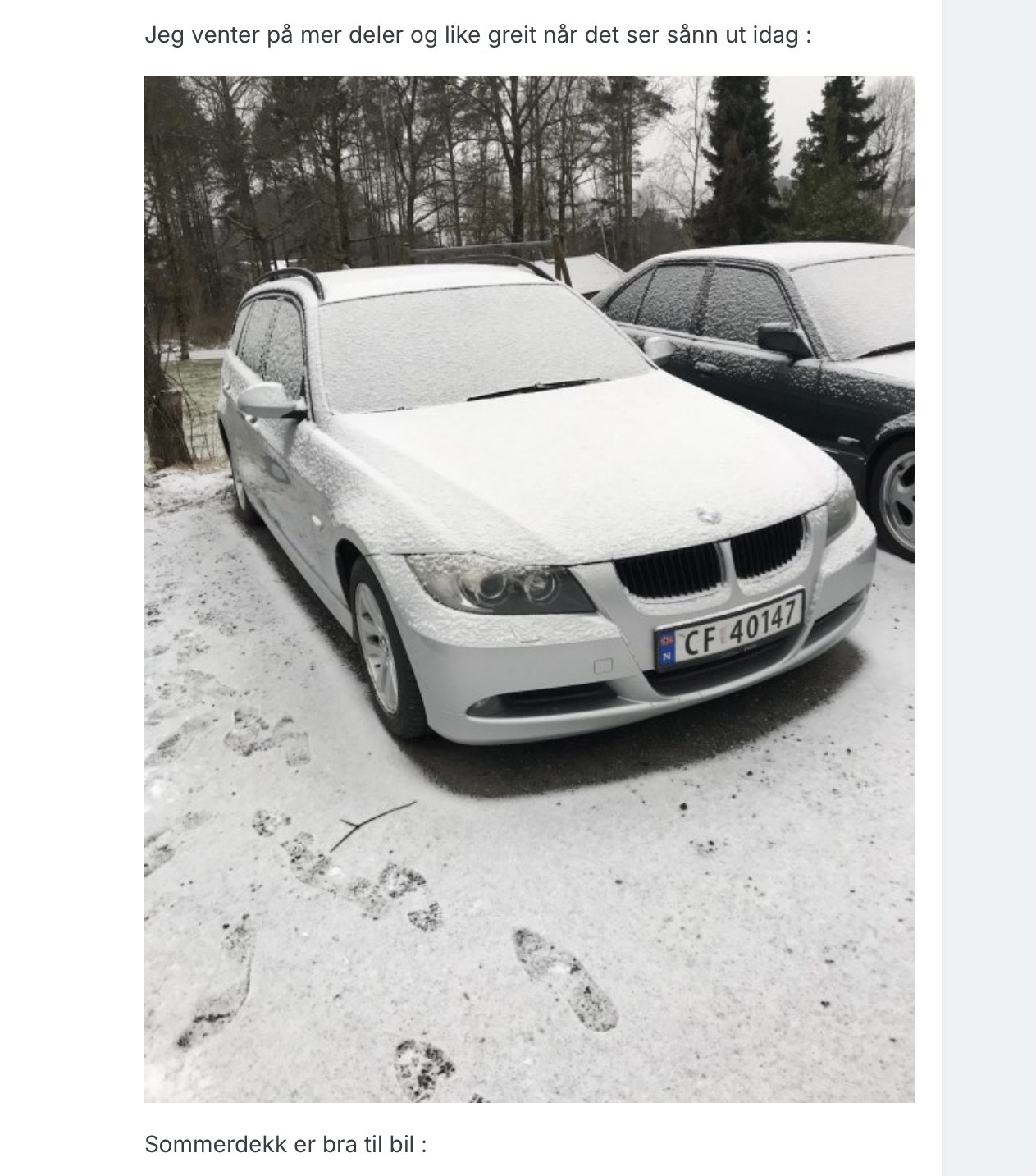 sveigis Skrevet Januar 28 Forfatter Skrevet Januar 28 Kan ta en liten oppdate på de siste dagers hendelser ,dog ikke mye men noe . Igår var jeg på garasjebesøk noe som alltid er koslig 😊 Der var det sveising av gammel Pajero det gikk i bla. Ellers ble det planlagt litt angående e61 og jobbene der . Greiere å stå inne når man skal til med litt mer omfattende jobb som manifold ,glødeplugger og evnt ledningsbrudd . Kjørt e61 nå hver dag de siste par dagene og man blir ikke lei .😊 Det er kaldt her og ikke vært gjort det store ,likevel idag så fikk jeg støvsugd bilen og fjernet snø inni den ,så nå er den ren : Bak : Var litt skruklar og lurte på om jeg skulle sprette spoiler bak og sjekke ut noen ledninger ,men kald vind og minus fem gjorde at jeg gikk inn isteden og satte meg på Finn 😊. Så da står den sånn isteden : Kan vise noen bedre bilder av caliper jeg ordnet forrige uke: Bedre og iorden : Visker bak på e91 knakk så det ble bestilt : Samt disse pyntedekslene til viskere foran: Dette er til e91 😊 Apropos Finn.no så kjøper ting jeg ikke trenger men greit og ha dobbelt av . Skvettlapper til e6x samler jeg på dvs alt av skvettlapper til Bmw 😊😊. Fant et vrak av en e6x som stod gjemt bla noe annet . Sendte en melding til han om der var skvettlapper foran på den og det var der . Lang story kort de kommer til meg til neste uke 😊. Kan aldri vite ,plutselig så kan der stå en e6x til . mr.pingu, Ampera, BimmerFan! og 2 andre reagerte på dette 5