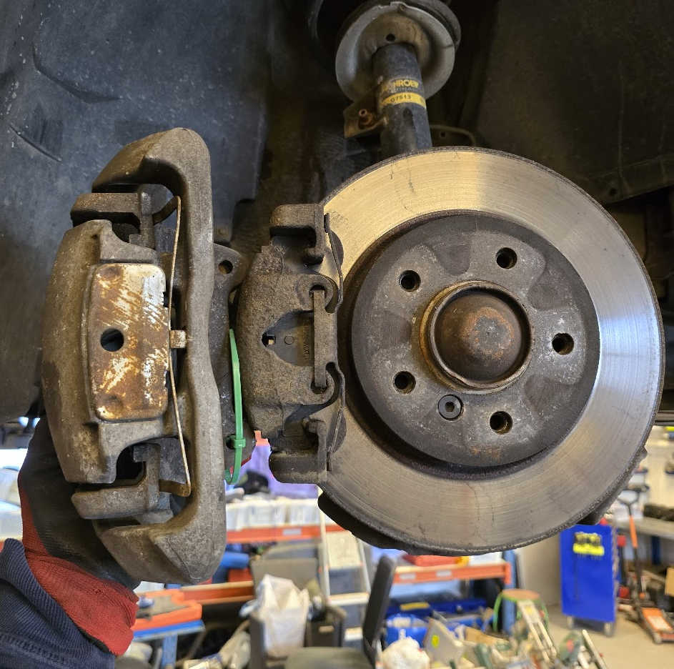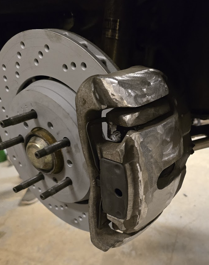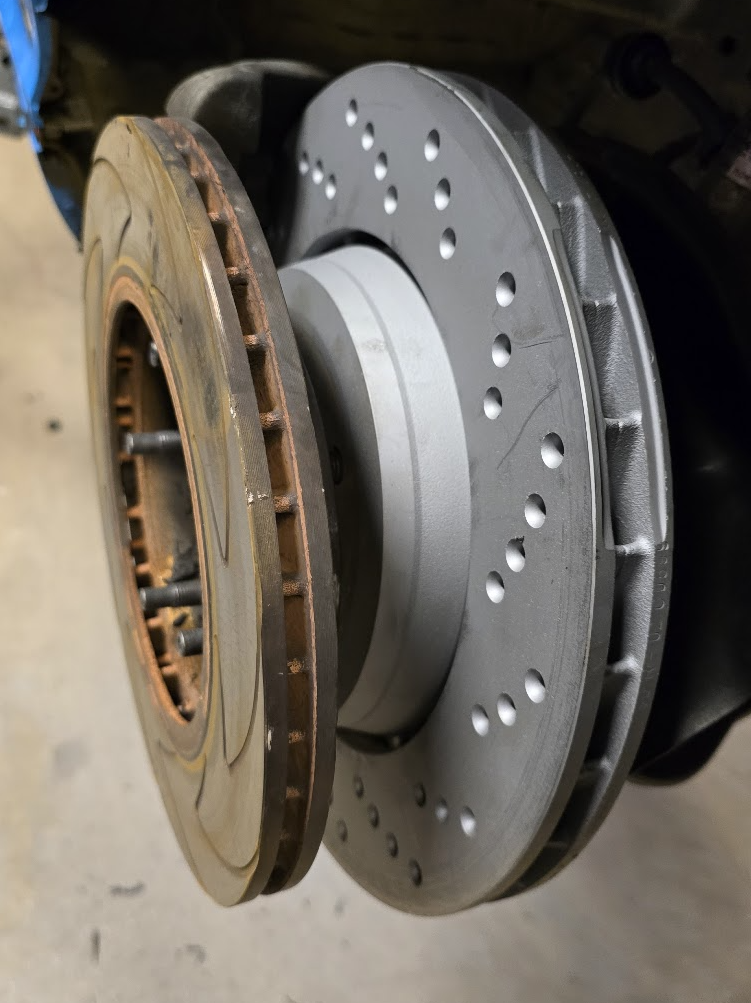 chiller Skrevet 4 timer siden Forfatter Skrevet 4 timer siden Vi har hele sesongen kjørt med orginale kalipere, og noen slissa skiver fra EBC i orginal dimensjon. Da vi ble invitert til å stille ut bilen på Oslo Motorshow følte vi at tiden nå var inne for å se litt mer racing ut. En avgjørende faktor var også at skivene hadde begynt å se rimelig slitte ut, selv om de var nye av året. Blir relativt varmt etter 6 timer med maks attack kan man si. Jeg hadde gjort litt research, og fått tak i E90 335i bremsekalipere med carrier (foran) for 1750 med frakt. De går da rett på med E46 M3 CSL-skiver (345mm diameter, 28 mm tykkelse, vs 300mm / 22 mm orginalt), uten noen form for spacere eller annet tull. Diametern på bremsesylinderen er også det samme, men det blir jo litt endret balanse på grunn av at det biter lengere ute. Her er størrelsesforskjellen: Det morsomme er at e90-kalipern er av aluminium, så selv om den er massivt mye større veier den mindre enn den orginale! Fant et bra tilbud på Zimmermann-skiver så da ble det de. Her er forskjellen: Alt dette var bolt on med bremseslanger fra E90. Det som dessverre ikke var bolt on var våre 17" felger. 345mm bremser fyller godt, men vi hadde målt og funnet ut at med noen timer med flappdisken så kunne dette gå. Og det gjorde det! Fylte felgen mye bedre, så nå ser den litt racing ut! Så da var det bare å kaste bilen på hengern og få den på Oslo Motorshow. Lars89 reagerte på dette 1