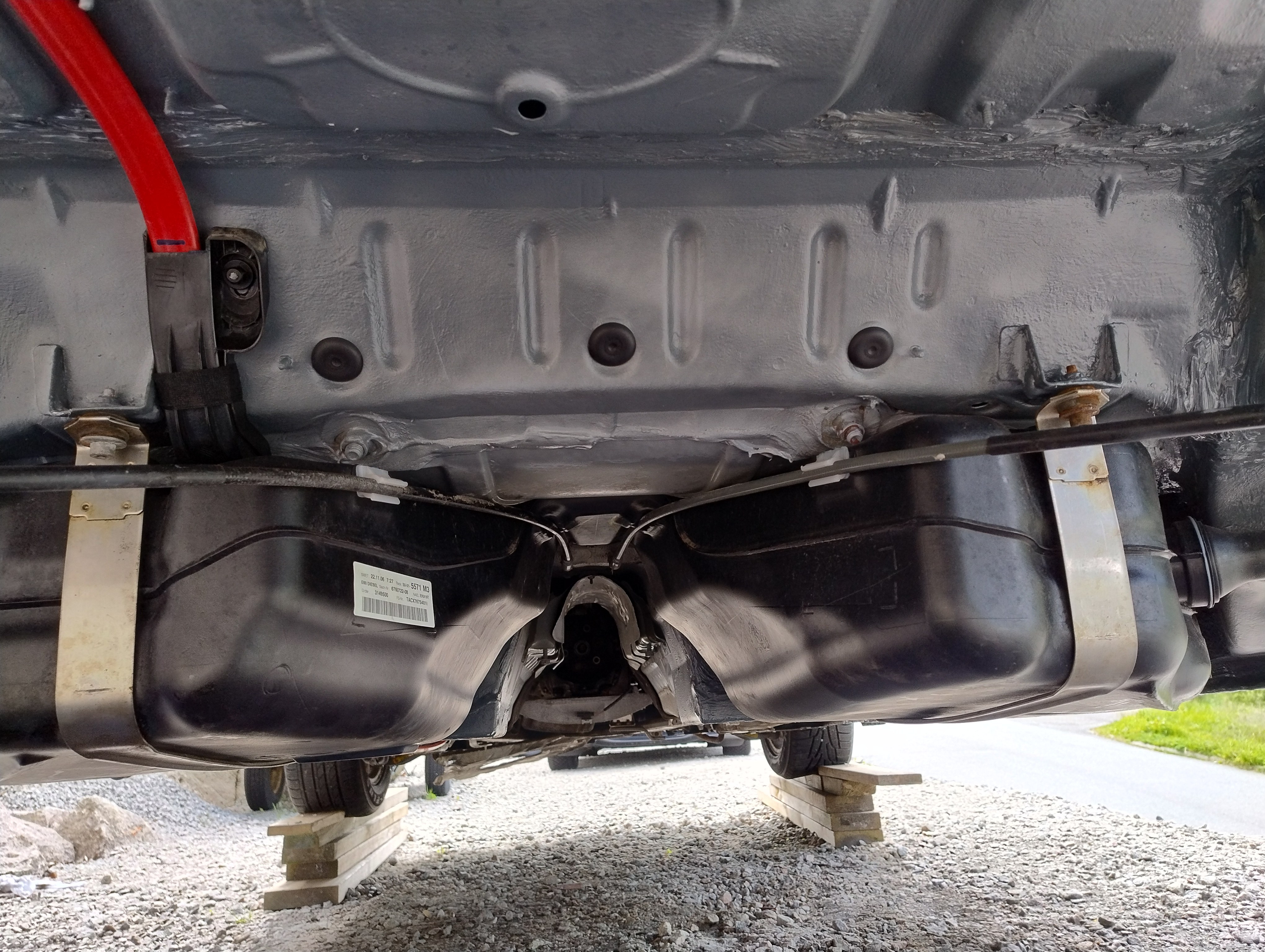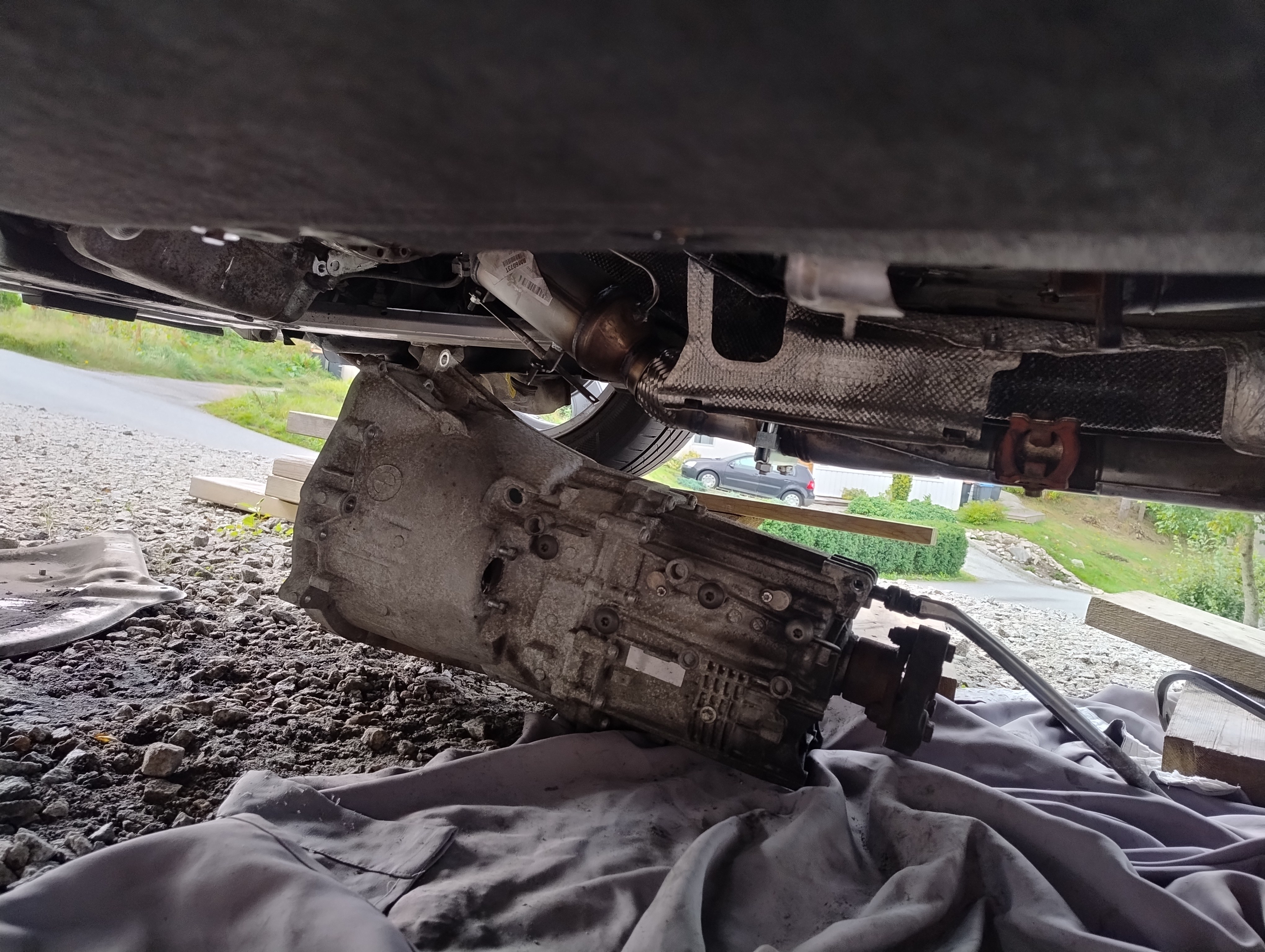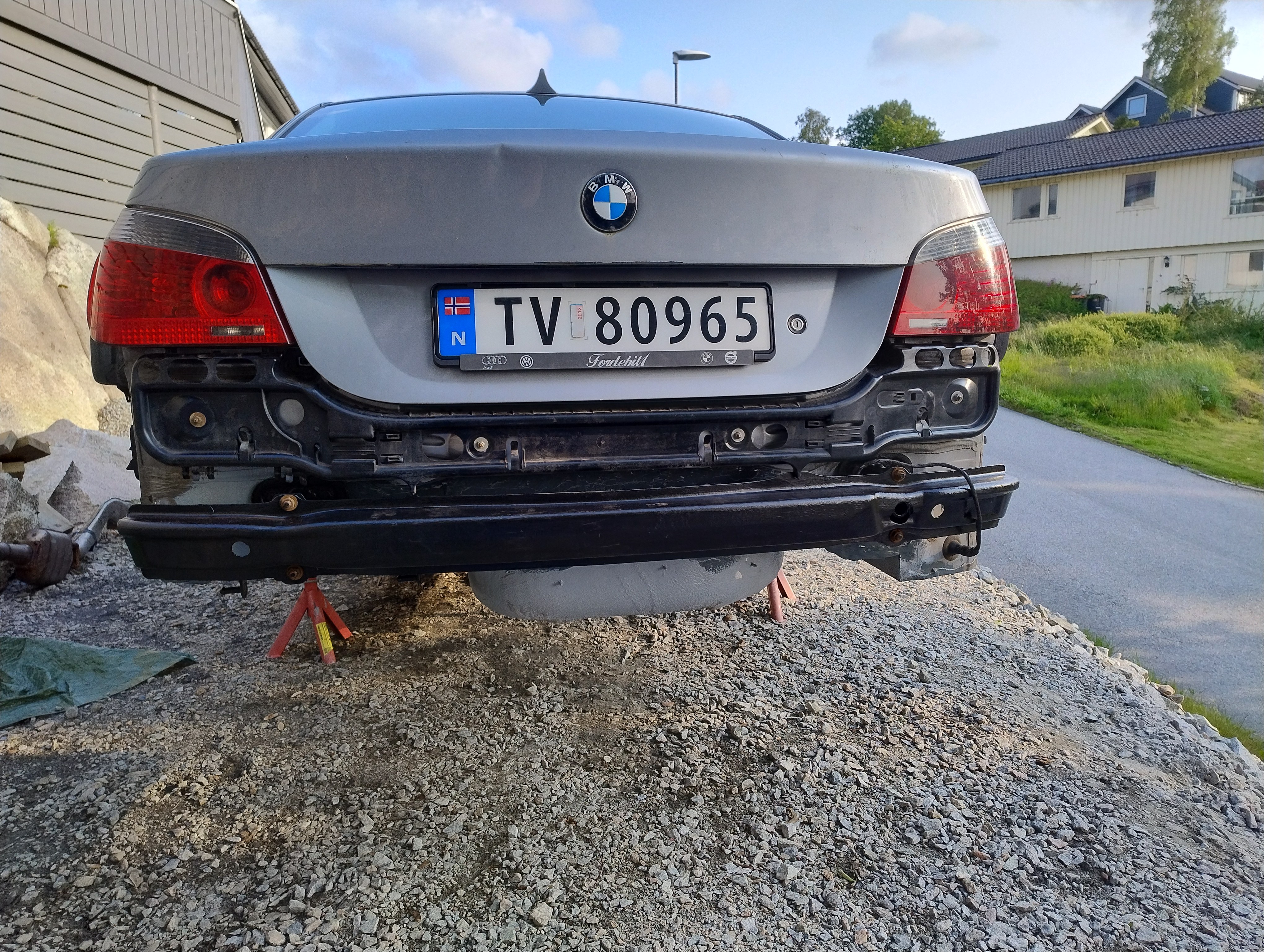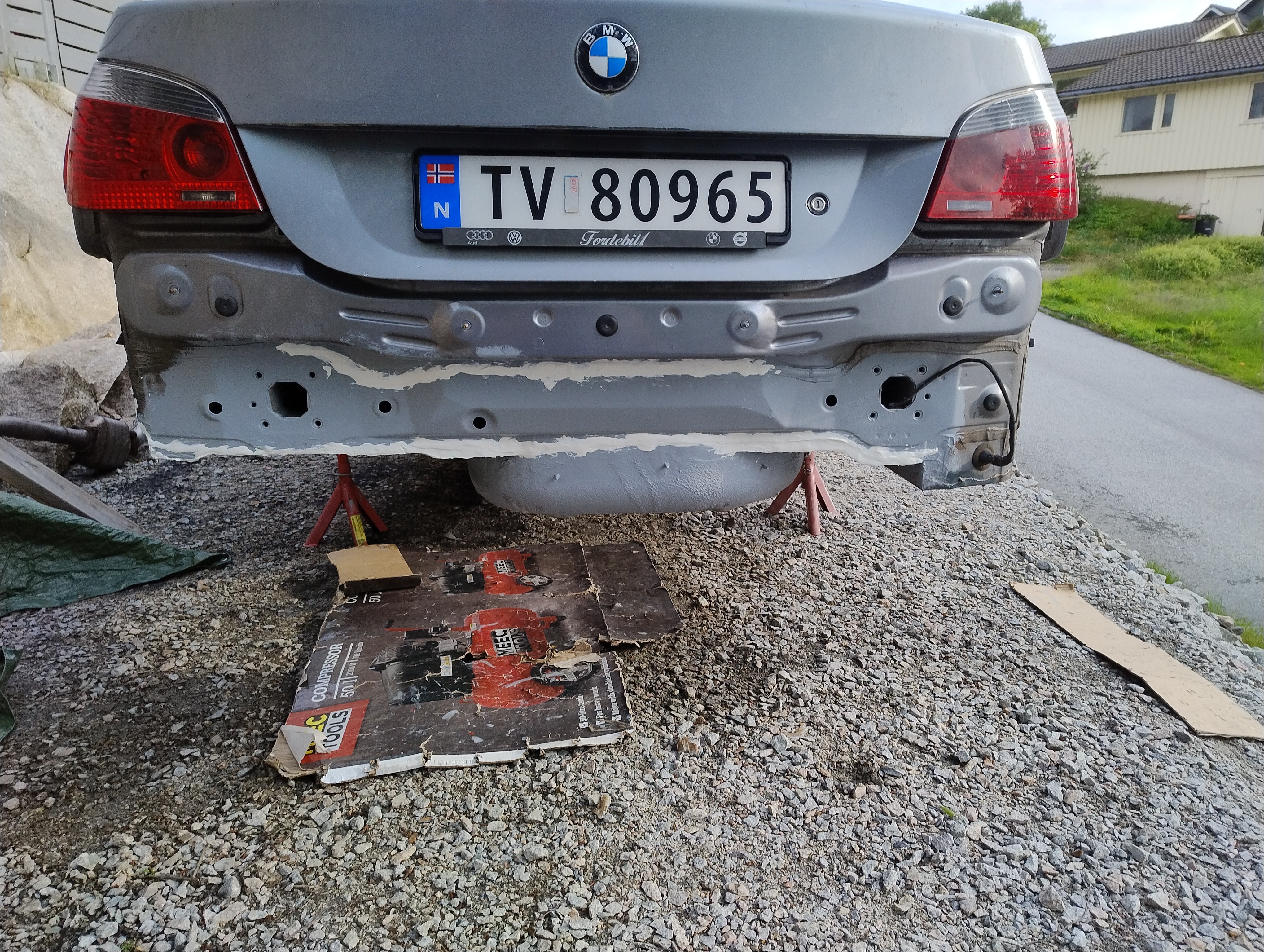 Haug530D Skrevet September 23 Forfatter Skrevet September 23 Da blir det litt fastforward her, jeg har lassevis av bilder men jeg tenker at jeg ikke trenger og bombardere tråden med bilder, skal bli bedre på bilder fremover jeg lover men anyway, kjøpte jo som sagt bilen uten og ha sett den og hentet den noen dager senere, den var treg og starte og i tilegg så var den veldig treg og få i gir, mer om det senere. men anyway, fikk den nå hjem og sjekket litt her og der hvilken deler jeg trengte og fikk bestillt opp, fikk også startet med og bytte diverse bærearmer og bremser, etter hvert så oppdaget jeg også det at denne bilen tydeligvis ikke hadde vært på recall i forbindelse med batterikabel i bagasjerom, her hadde det tydeligvis vært fyr baki Selger opplyste ikke om dette i anonnse men bilen ble nå solgt som repobjekt/delebil som den er osv... så det var vel litt min egen feil også, men men, jeg elsker faktisk utfordringer, så etter og ha studert baki der hvor forrige eier hadde laget noe jallamekk med korrugert rør og hjemmemekka strømkabel bestemte jeg meg for at her skal hele travers ned, samt diesel tank (siden jeg har hatt nede travers på E87 og regnet med at det nok var mer rust enn det man så. Så igjenn litt fastforward her, for en del har jeg visst ikke tatt bilder av, blant annet den hjemmemekka strømkabel løsningen, hehe, men uansett dette bildet viser nå litt av galskapen. Her er travers og diesel tank allerede tatt ned og man ser til høyre i bildet der hvor altså bodykiten har smeltet og sprukket blant annet. På enden der på strømkabel ser man også rester etter det korrugerte røret, slik hang det egentlig under bilen, så hadde kabel tatt borti karosseri igjen ja da hadde det tatt fyr igjen. Nytt bilde av samme sted men fra en annen vinkel.