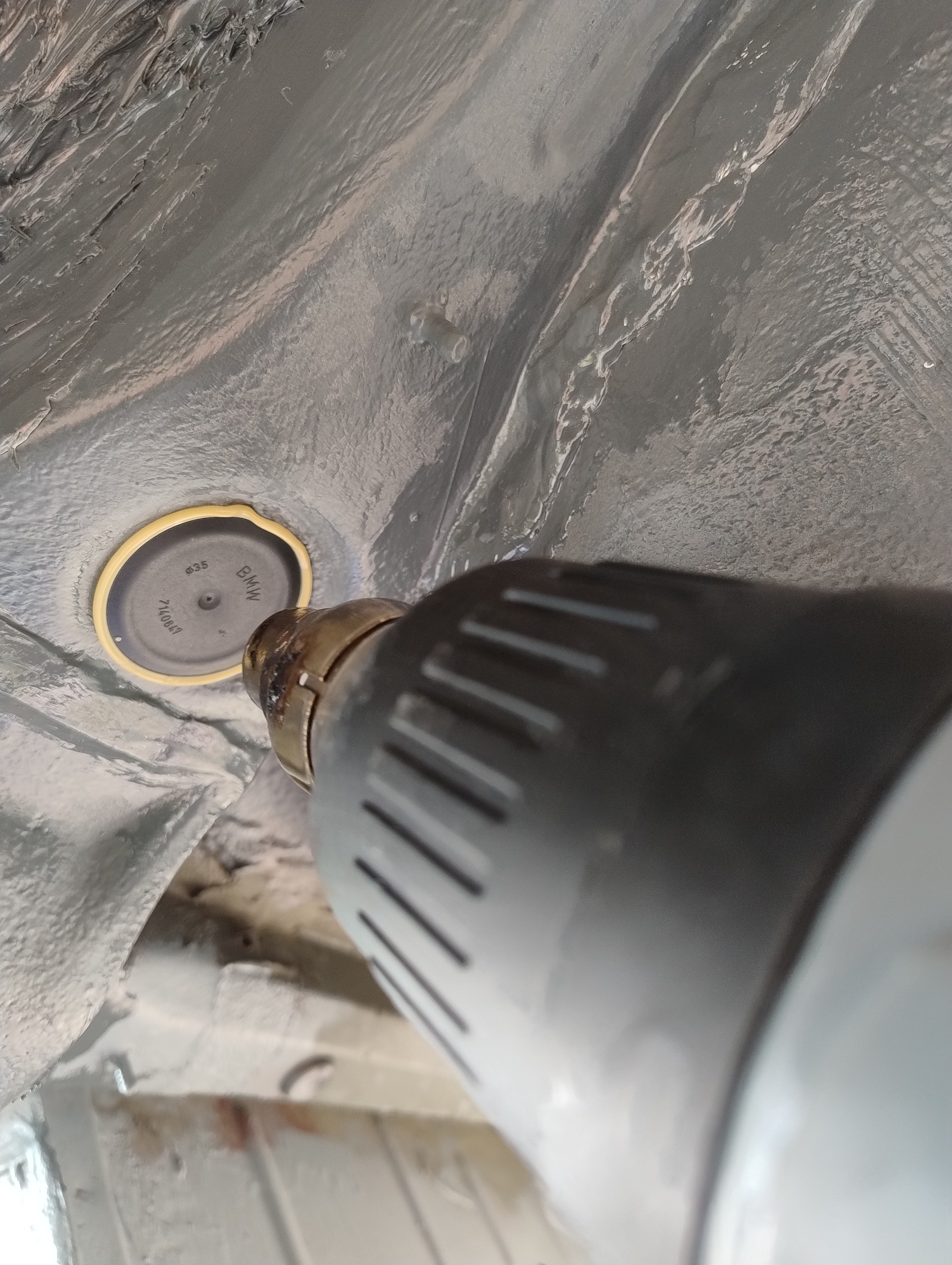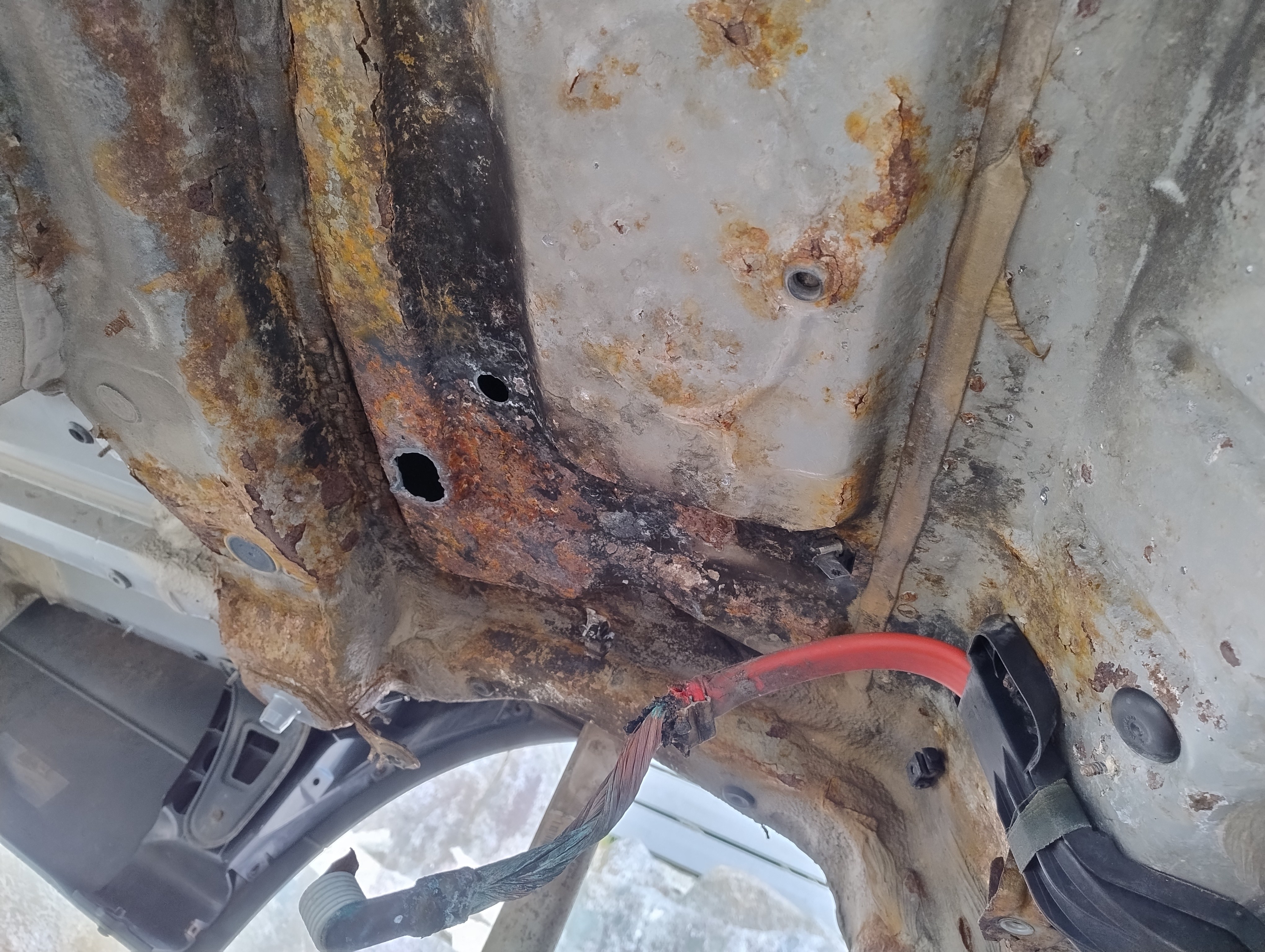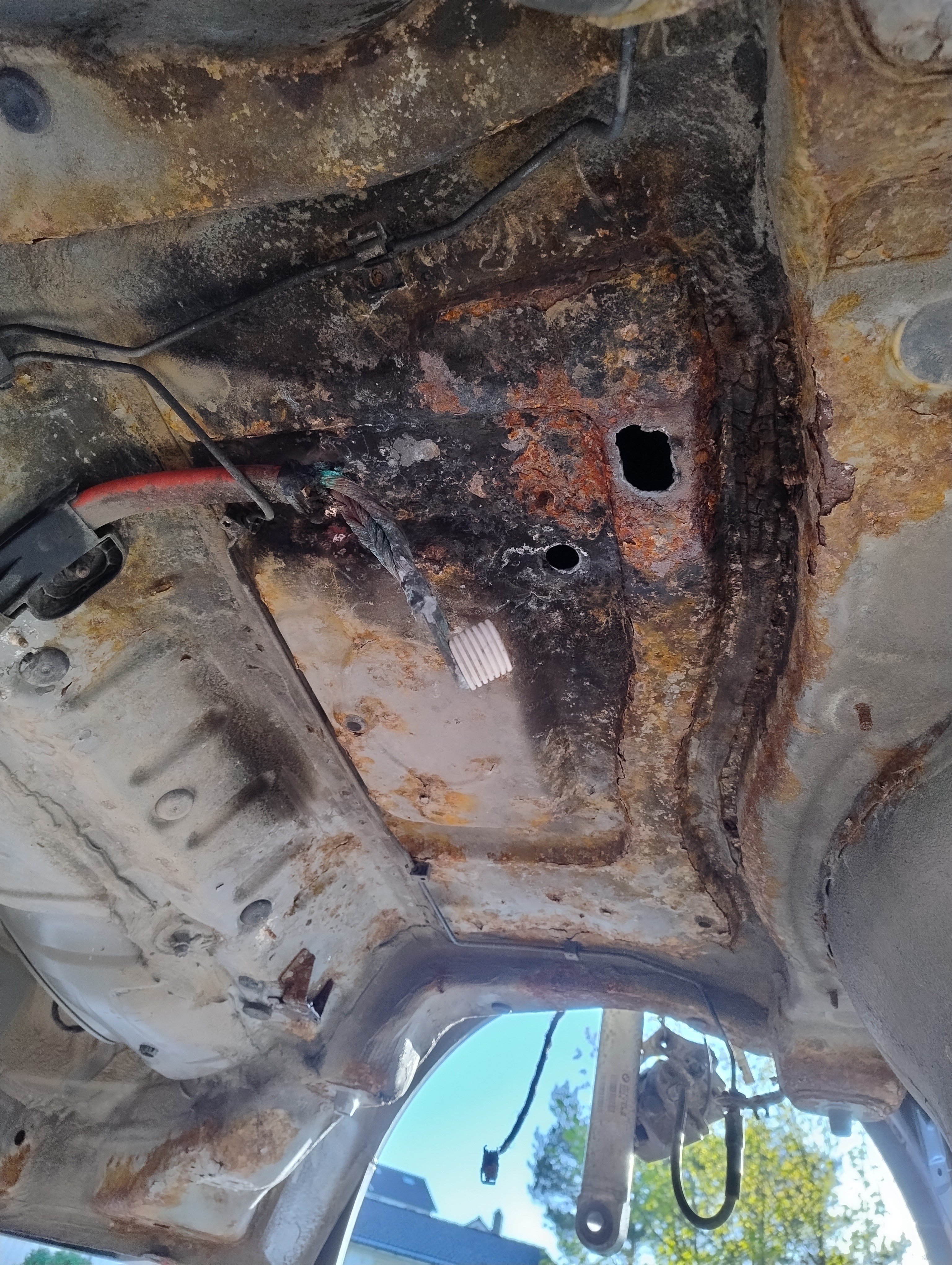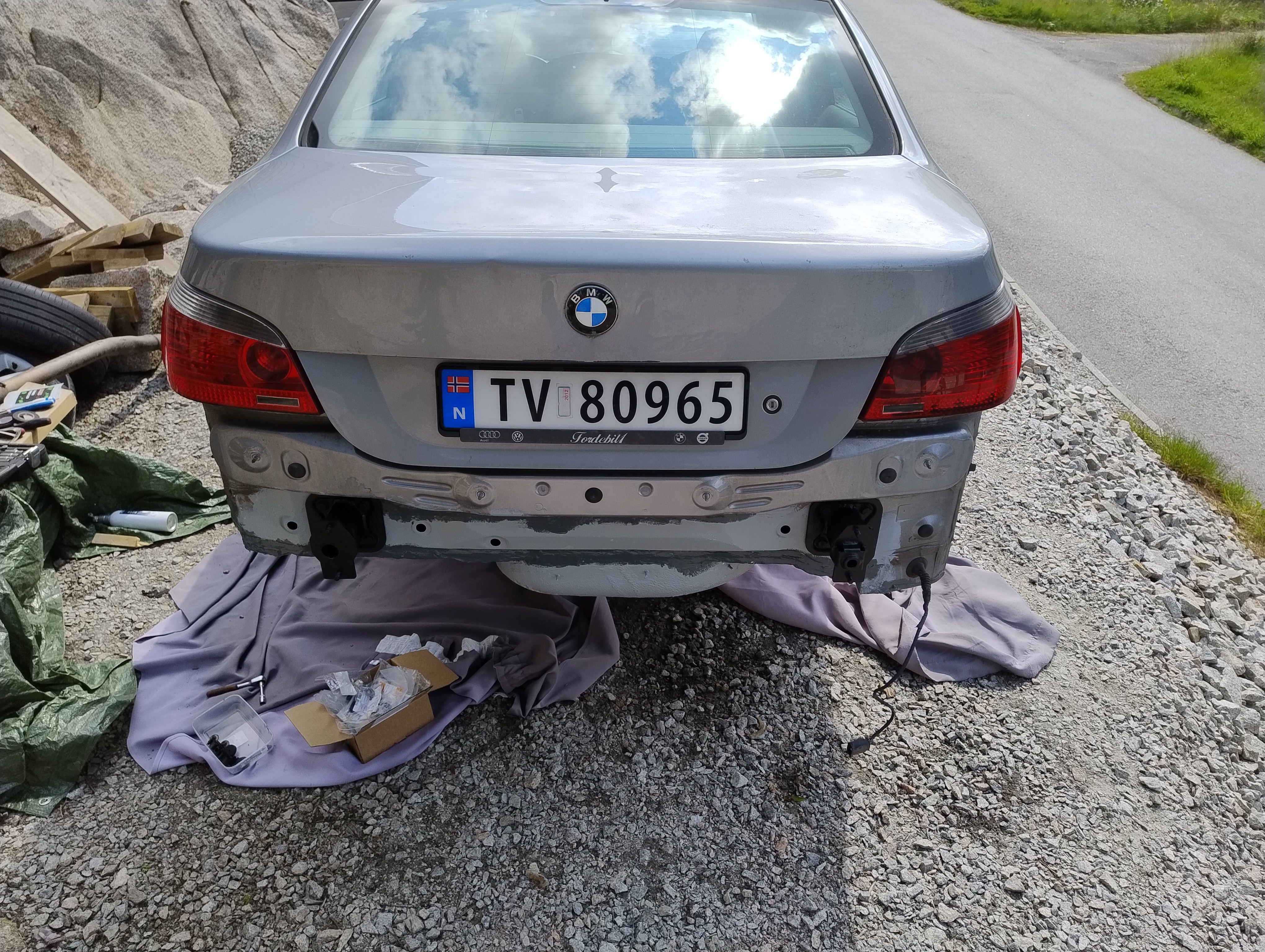 Haug530D Skrevet September 23 Forfatter Skrevet September 23 Da blir det litt fastforward her, jeg har lassevis av bilder men jeg tenker at jeg ikke trenger og bombardere tråden med bilder, skal bli bedre på bilder fremover jeg lover men anyway, kjøpte jo som sagt bilen uten og ha sett den og hentet den noen dager senere, den var treg og starte og i tilegg så var den veldig treg og få i gir, mer om det senere. men anyway, fikk den nå hjem og sjekket litt her og der hvilken deler jeg trengte og fikk bestillt opp, fikk også startet med og bytte diverse bærearmer og bremser, etter hvert så oppdaget jeg også det at denne bilen tydeligvis ikke hadde vært på recall i forbindelse med batterikabel i bagasjerom, her hadde det tydeligvis vært fyr baki Selger opplyste ikke om dette i anonnse men bilen ble nå solgt som repobjekt/delebil som den er osv... så det var vel litt min egen feil også, men men, jeg elsker faktisk utfordringer, så etter og ha studert baki der hvor forrige eier hadde laget noe jallamekk med korrugert rør og hjemmemekka strømkabel bestemte jeg meg for at her skal hele travers ned, samt diesel tank (siden jeg har hatt nede travers på E87 og regnet med at det nok var mer rust enn det man så. Så igjenn litt fastforward her, for en del har jeg visst ikke tatt bilder av, blant annet den hjemmemekka strømkabel løsningen, hehe, men uansett dette bildet viser nå litt av galskapen. Her er travers og diesel tank allerede tatt ned og man ser til høyre i bildet der hvor altså bodykiten har smeltet og sprukket blant annet. På enden der på strømkabel ser man også rester etter det korrugerte røret, slik hang det egentlig under bilen, så hadde kabel tatt borti karosseri igjen ja da hadde det tatt fyr igjen. Nytt bilde av samme sted men fra en annen vinkel.