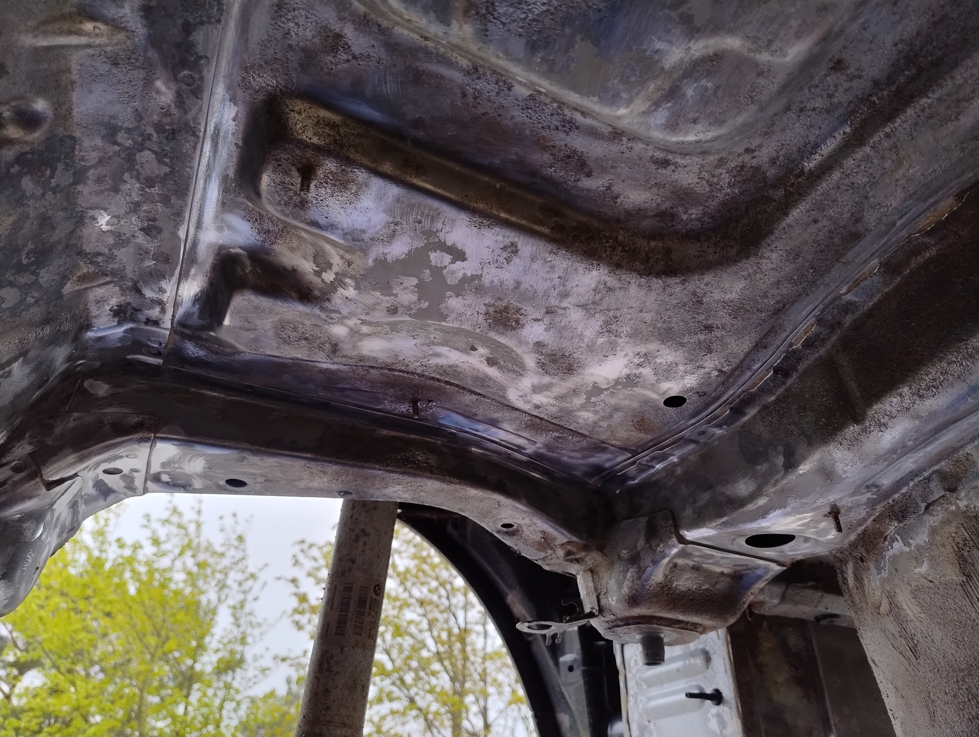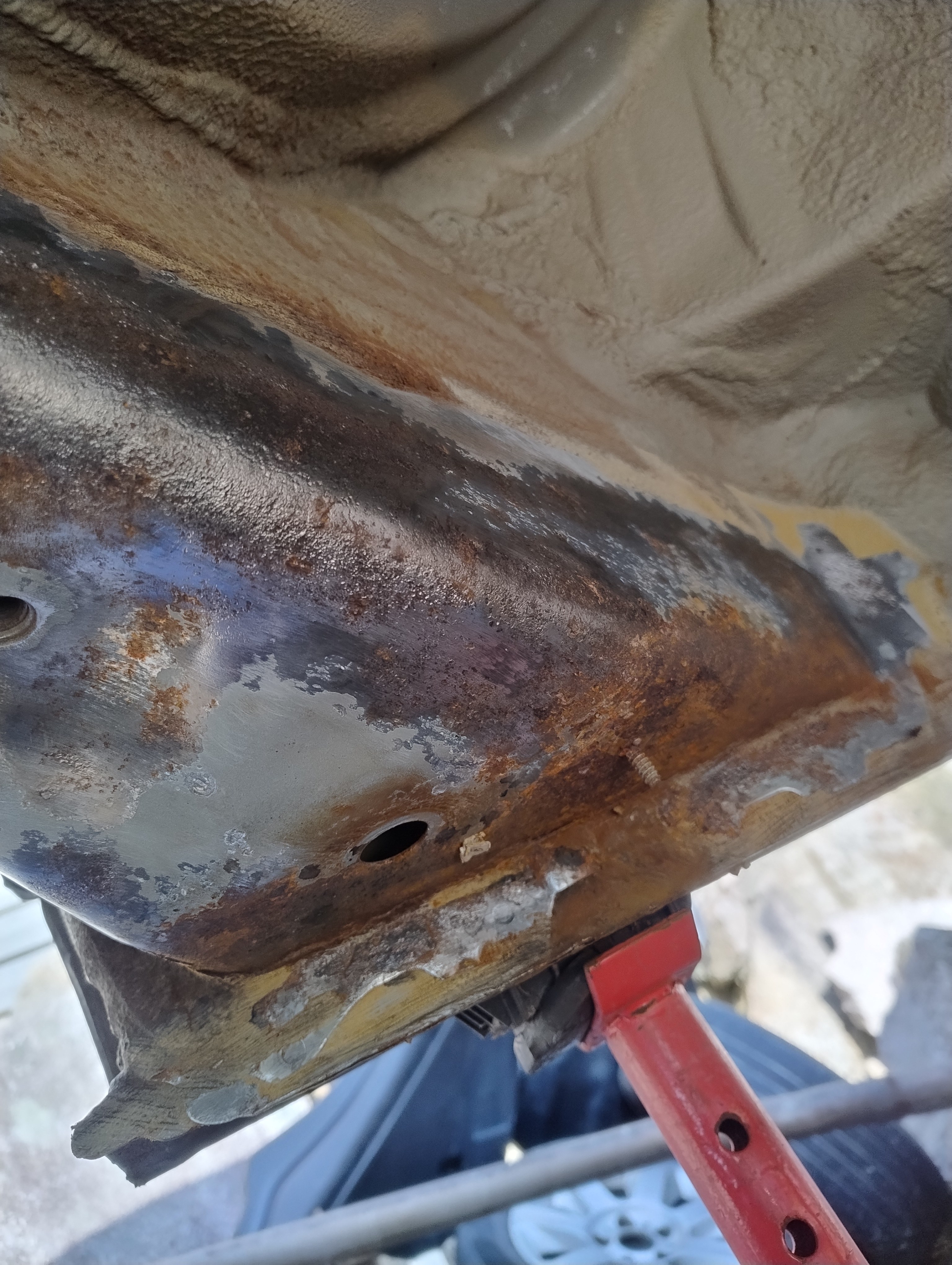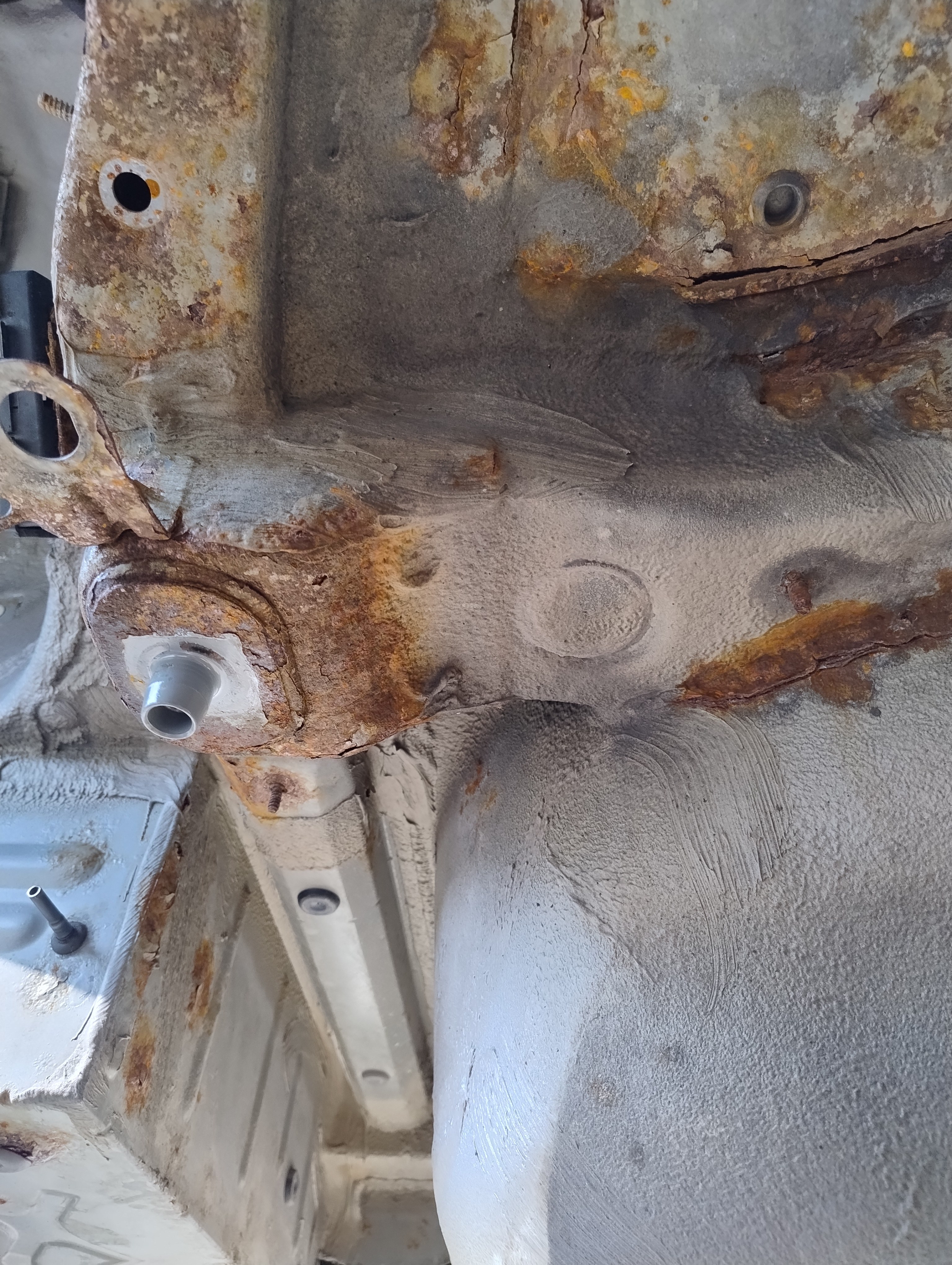 Haug530D Skrevet September 23 Forfatter Skrevet September 23 Så var man igang med rustfjerning, sist jeg holdt på med dette så leigde jeg en Kaeser M50 som kan levere 5 kubikk med luft ved 7 bars trykk så luft nok i massevis (Tror jeg brukte 15l med diesel ca) Men denne gangen tenkte jeg og bare ta det over litt lengre tid og bruke roterende stålkost, litt bilder av prosessen. Dette er da etter noen runder med slipemaskin og borremaskin og jommen meg dukket det opp ett ekstra hull ved siden av batterikabelhull, så da ble det jo til at jeg måtte kappe ut litt og sveise inn nytt stål, usikker på om jeg har bilder av dette, men om jeg finner så dukker det nok opp i tråden her ja Olaandref reagerte på dette 1
