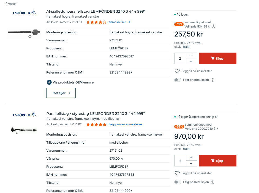 thansen Skrevet Tirsdag kl. 09:16 Forfatter Skrevet Tirsdag kl. 09:16 21 hours ago, HakonLimseth said: Bildeler.no oppgir at det indre endeleddet/styrestaget er 219 mm. De lover å levere riktig del første gang, og jeg har aldri opplevd å få feil deler fra dem. Et eksempel er da jeg måtte bytte bakbremser på en Audi. VAG-gruppen bruker PR-koder for å spesifisere hvilke skiver som passer, men disse kodene kan være vanskelige å få tak i. Derfor opplevde jeg at både Skruvat, Eurodel og Autodoc hadde tre ulike alternativer å velge mellom. Hos Bildeler.no fantes det derimot bare ett og det viste seg å være riktig (Fikk det også bekreftet av Møller bil). Personlig ville jeg derfor valgt å stole på dem, men selvfølgelig sjansen er der for at de også tar feil. eurodel bekreftet det du sa tidligere at det kun handler om hvor produsente måler stagen ifra. Så alle indre endeledd skal passe.