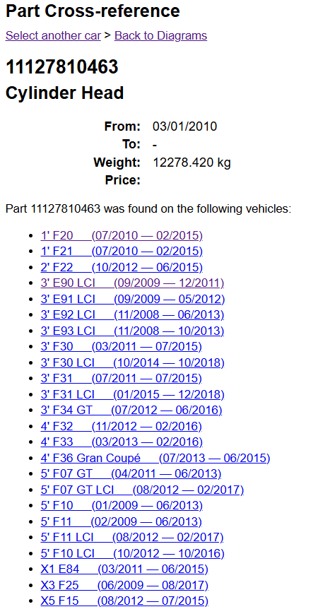 qwerty3009 Skrevet 8 timer siden Skrevet 8 timer siden Hei der! Har nå en F11 2011 modell med defekt N47 motor og ser derfor etter en ny motor. Klarer dog ikke helt å bli klok på hva som passer og ikke. Slår jeg F11en opp i delekatalogen ser det ut som den har mange av de samme delene som resten av f-serie bilene i samme årgang. I tillegg ser det ut som at den deler mye med E9x LCI og E84 (x1). Slår jeg feks en e90 LCI i katalogen, står det ikke at denne har deler som passer F10/F11 eller andre f-serie biler. Er det fordi katalogen ble "produsert" før de kom på markede og dermed ligger de ikke inne? Ingen av delenummerene som kommer opp i e90 katalogen er ikke nødvendigvis listet under f11 katalogen. Tar jeg toppen som et eksempel så står det følgende i F11 katalogen: Slår jeg opp en E90 med produksjonsdato etter 2009, får jeg ikke nødvendigvis opp det samme svaret. Er fellesnevneren her at jeg må finne en motor som er N47T? Vil en uten T passe? Utvalget på huggere blir vesentlig bedre om jeg kan få inn en N47 fra en E-serie. Takk for alle svar!