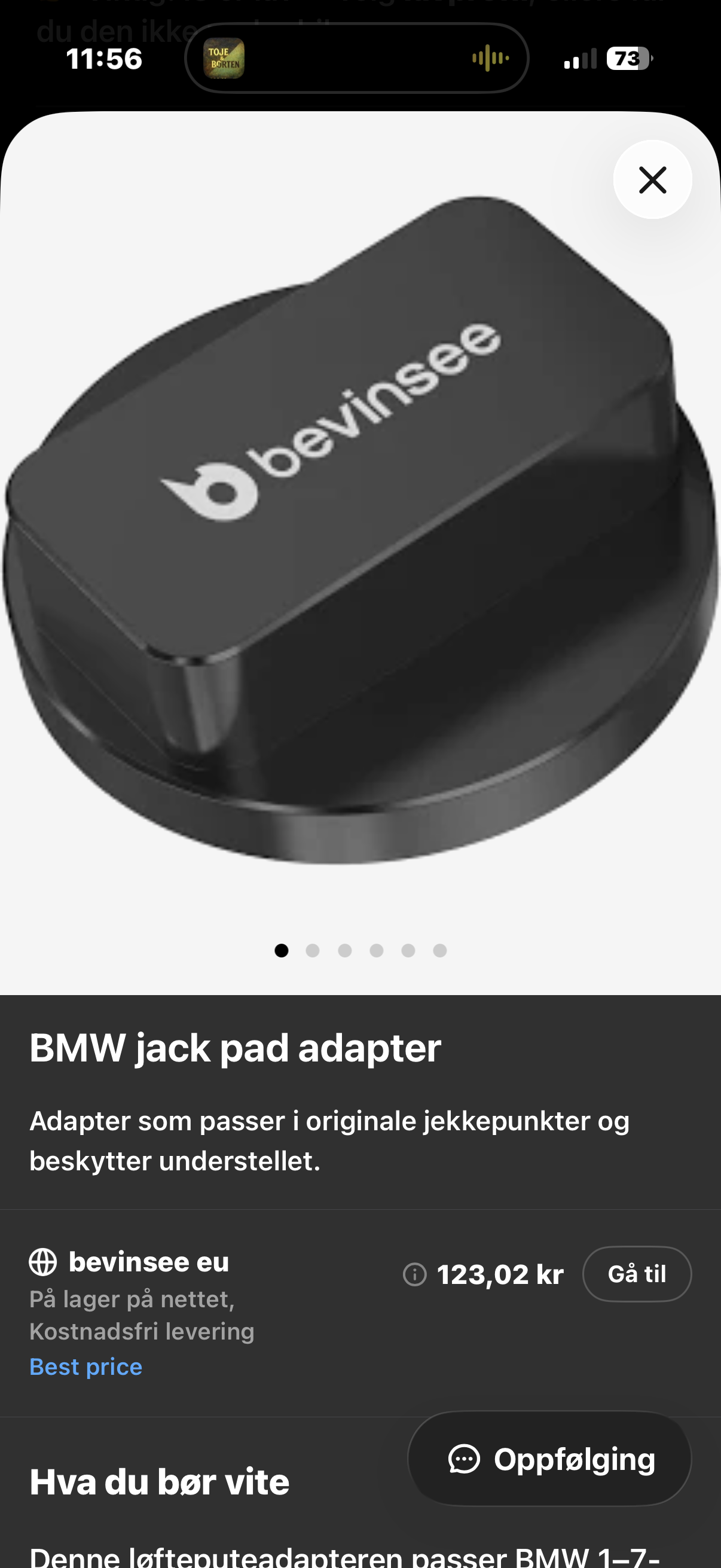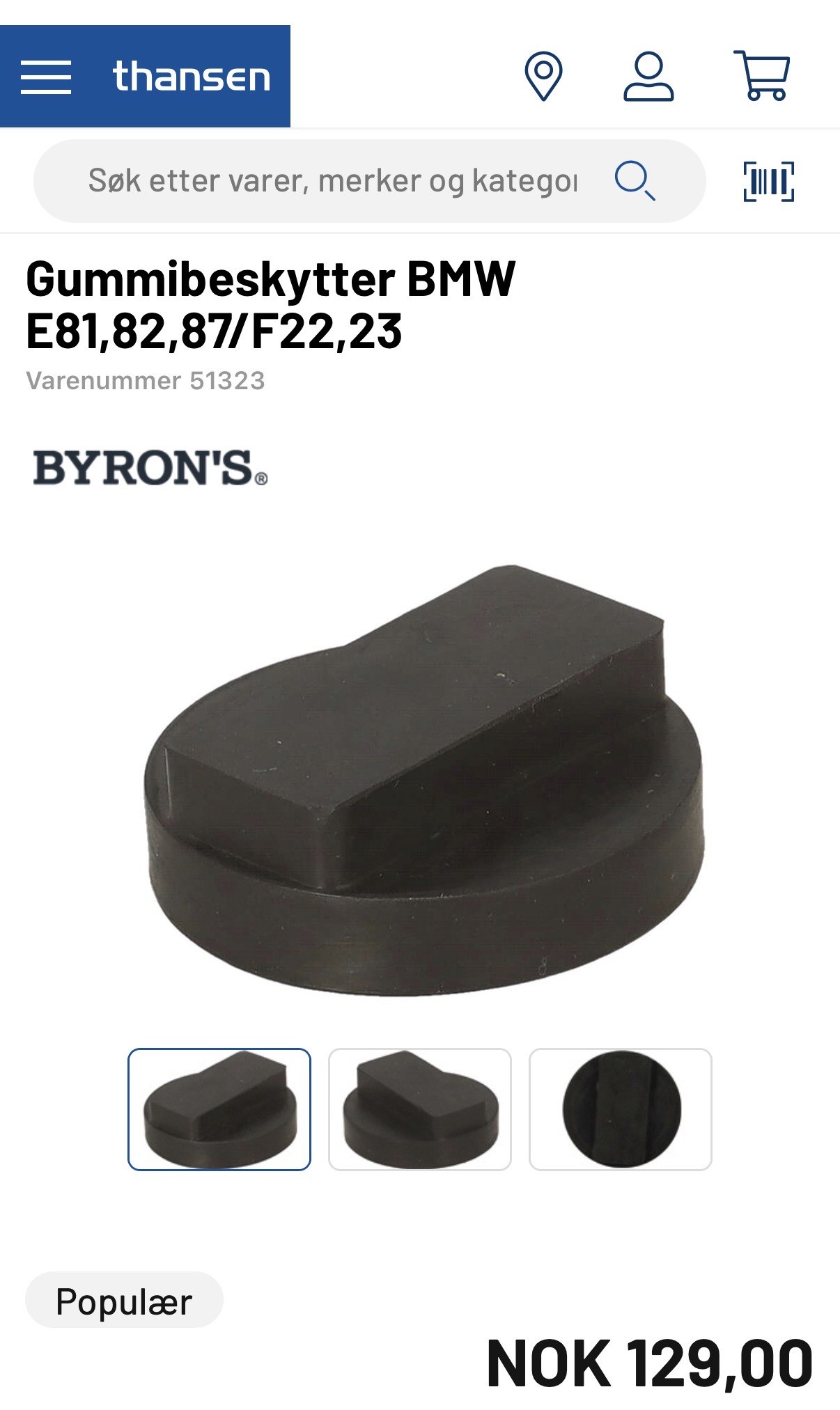 *MrB* Skrevet 13 timer siden Skrevet 13 timer siden De er vel universale på alt av BMW fra ca E39 og E46 og oppover. Har en sånn kloss selv, men er litt styrete å treffe. Som regel gir jeg blaffen og jekker på pad’en til jekken. Den er flat og gjør ingen skade på festet i bilen.