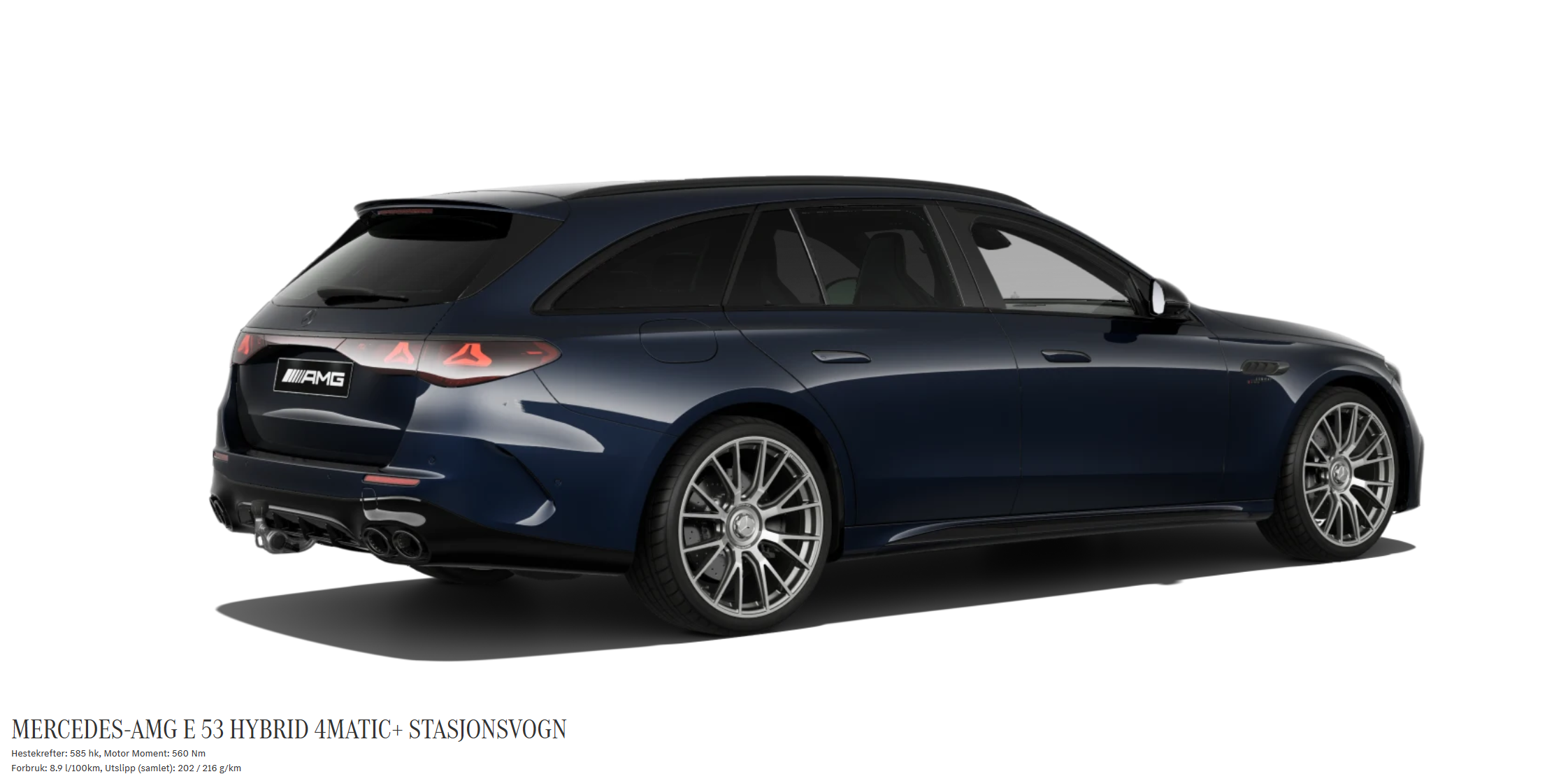 LP760 Skrevet 4 timer siden Skrevet 4 timer siden (endret) Dessverre så måtte det bli Mercedes denne gangen, grunnet behov og opplevelsen jeg hadde ved prøvekjøring (og det var ikke denne utgaven engang!) Valget falt på Mercedes-AMG E 53 Hybrid 4MATIC+ Den har samlet sett en bedre kombinasjon av ytelse, plass, firehjulsdrift, og komfort tilpasset bruken vi har... Totalpakken en BMW 5-serie stasjonsvogn var ikke det samme altså. Kjøpsobjekt Modell: Mercedes-AMG E 53 Hybrid 4MATIC+ Stasjonsvogn Årsmodell: 2027Drivlinje: Plug-in hybrid, 4MATIC+ firehjulsdrift Valgt utstyr Utstyrspakke Standard (inkludert) Design og stil Lakk: Nautic Blue Metallic – Felger: 53,3 cm (21") AMG krysseikede felger – Setetrekk: Nappaskinn Brown / Black – Listverk: Bakbelyst Open Pore Grey Ash Wood – Ekstrautstyr Panoramasoltak – Tilhengerassistent – Oppvarmede seter bak – Taktrekk Black MICROCUT – THERMOTRONIC klimakontroll – 3D Driver’s Display – Traffic Sign Assist – AMG Performance-ratt i nappaskinn / MICROCUT – AMG Nattpakke – AMG Nattpakke II – AMG Performance setepakke – Kjøreassistentpakke Plus – Hurtiglading – Valgfritt tilbehør 19" vinterhjul – Nokian uten pigg – Alle priser er oppgitt ekskl. mva. Inkludert utstyr (utdrag) Eksteriør AMG-spesifikk grill i sort høyglans Opplyst radiatorgrill Mørktonet glass Sorte takrails Elektrisk innfellbare speil Hengerfeste med ESP® stabiliseringsfunksjon Interiør AMG Real Performance Sound Elektriske forseter med minne Klimatiserte forseter Multikontursetepakke Dashboard og dørsider i kunstskinn med nappa-look Radio & multimedia Burmester® 4D surround sound system MBUX Augmented Reality Navigation Remote & ladetjenester Plus (3 år inkl.) Sikkerhet & teknologi AMG high-performance bremsesystem Kne-airbag Køinnhentingsfunksjon Pakker DIGITAL LIGHT Mercedes-AMG eksteriør- og interiørpakke Premium-pakke Parkeringspakke med 360° kamera Vinterpakke Lading AC-ombordlader opptil 11 kW Ladekabel for wallbox, 7 m Endret 4 timer siden av LP760 papertiger, eivi91, Otis og 9 andre reagerte på dette 12