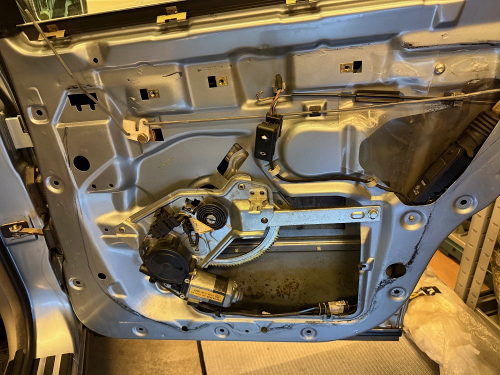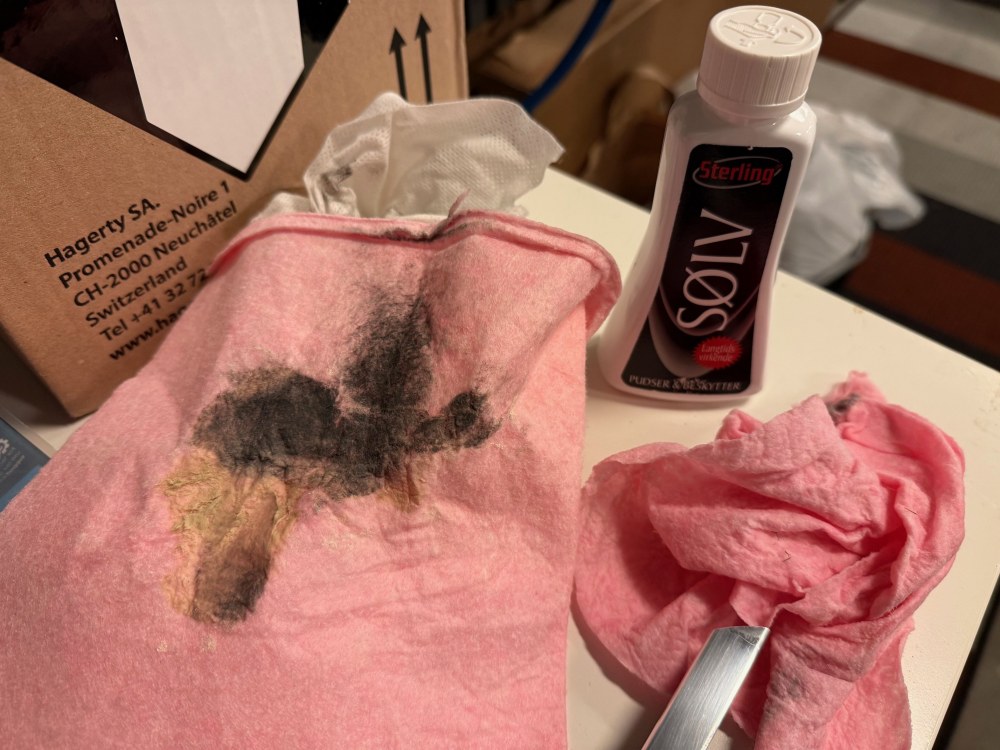 Da fikk jeg omsider vekk alt sandstøv, smuss og annet dritt under løvdeksler. Viskermotor rengjort og smurt opp, samt løvdeksler endte opp i glossy utførelse. Bra det! Gjenstår å sette tilbake klips og viskerblader.