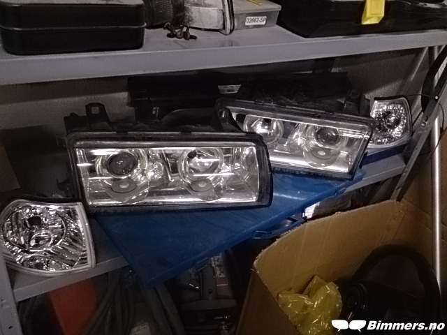 har et sett med hovedlamper til e36 liggende. disse er Hella med angeleyes og chrome reflektorer. blinklysene passer sedan, men hovedlampene passer alle e36. kom med bud.