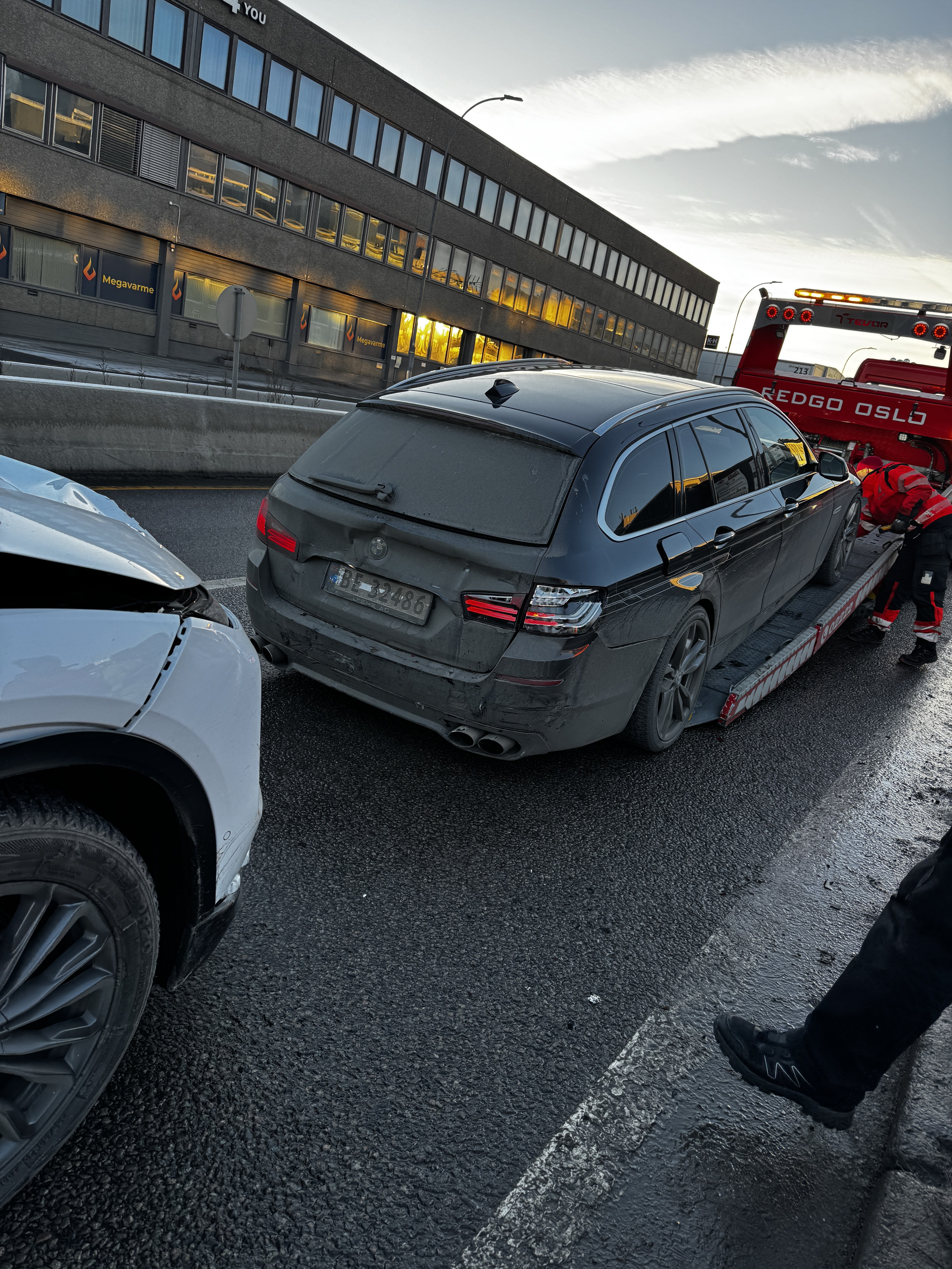 Ja får håpe den ikke skrives av! Kan fort være mye skjulte skader på sånt skjermer virker hele men sjekket ikke så nøye, men luka er låst, glasset poppet men fikk ikke opp gulv plate for og ta ut slepekrok så frykter den er litt klemt under ..