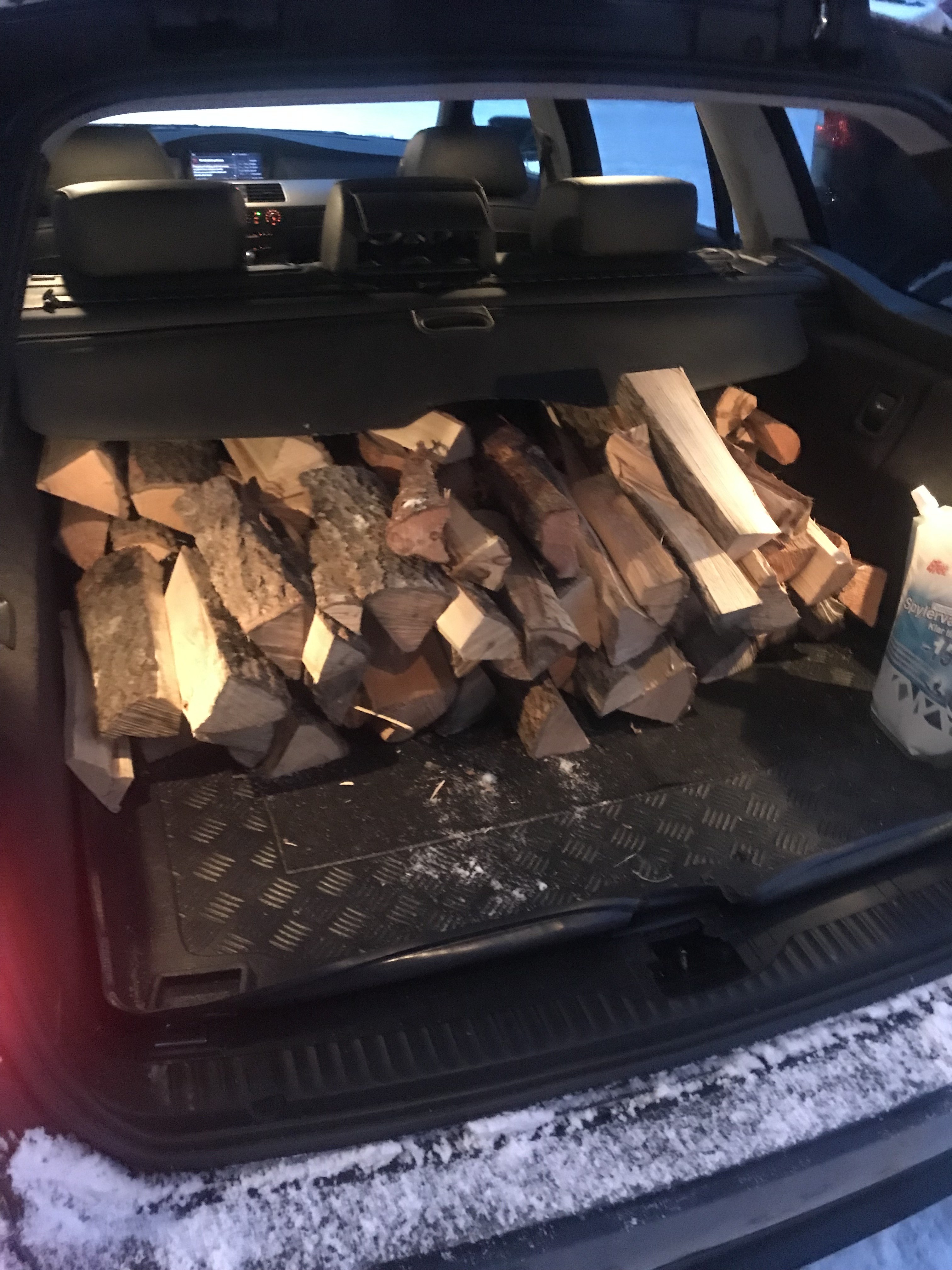 Igår måtte jeg avgårde en tur og i den forbindelse måtte jeg bruke e61en . Som nevnt tidligere er batteriet dårlig og bil stått noen dager ,men fikk liv i den : Går fort og Tine den av : Og hva skulle jeg ? Jo ei venninne av kona hadde endel ved hun skulle kvitte seg med som vi kunne få . Har jo ikke hengerfeste så ble fire turer med fullt bagasjerom og her fra opplasting : Lastet selvsagt ikke opp til taket her men gjevnt med ryggen til baksetet og fikk plass til litt. Når jeg sa at jeg hadde brukt den sorte til sånn kjøring ,falt ikke det i god jord til fruen men .. Et bilde fra vedkjøring: Så skal visst e91 på høyfjellet nå i februar 😊 Kona og to andre skal opp til Rauland på skitur og hotell . Og det er med skrekkblandet fryd jeg sender de avgårde så langt med Treg 18 opp daler ,ned daler og sprengkaldt men jeg har trua faktisk . Og klarer den det ,da har den forlengst bestått eksamen føler jeg .🥳