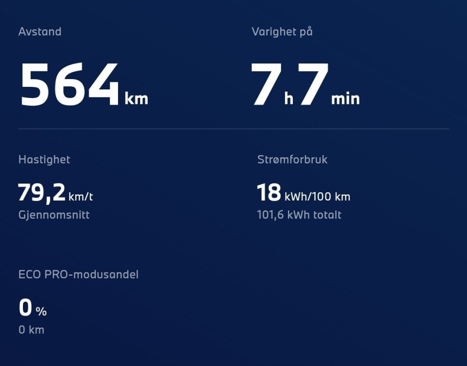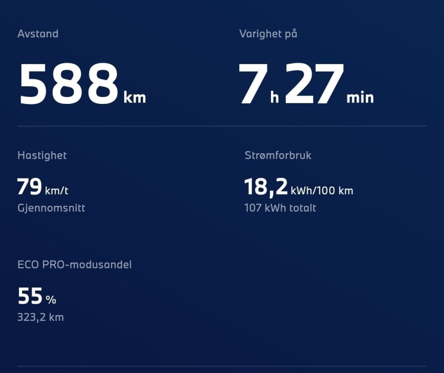 Hadde ikke brukt ecopro på ett par år, så måtte teste igjen Gasspedalen blir litt sløvere, så det kan være litt mer behagelig til de som sitter på når man ikke er glad i cruisecontrol. Men merket når man kom i 110 sonene og skulle ligge i 120, så måtte man gjette gasspedalen mer for å holde farten. Så på tur hjem ble det tilbake til sport, får jeg heller beherske høyrefoten litt mer 😅 Har jo testet med i3 før og aldri merket noe særlig forskjell i modusene, men den kjører jo aldri så langt. Ser jo snittfarten er bittelitt høyere på tur hjem også. Så kjør i den modusen du liker best er konklusjon