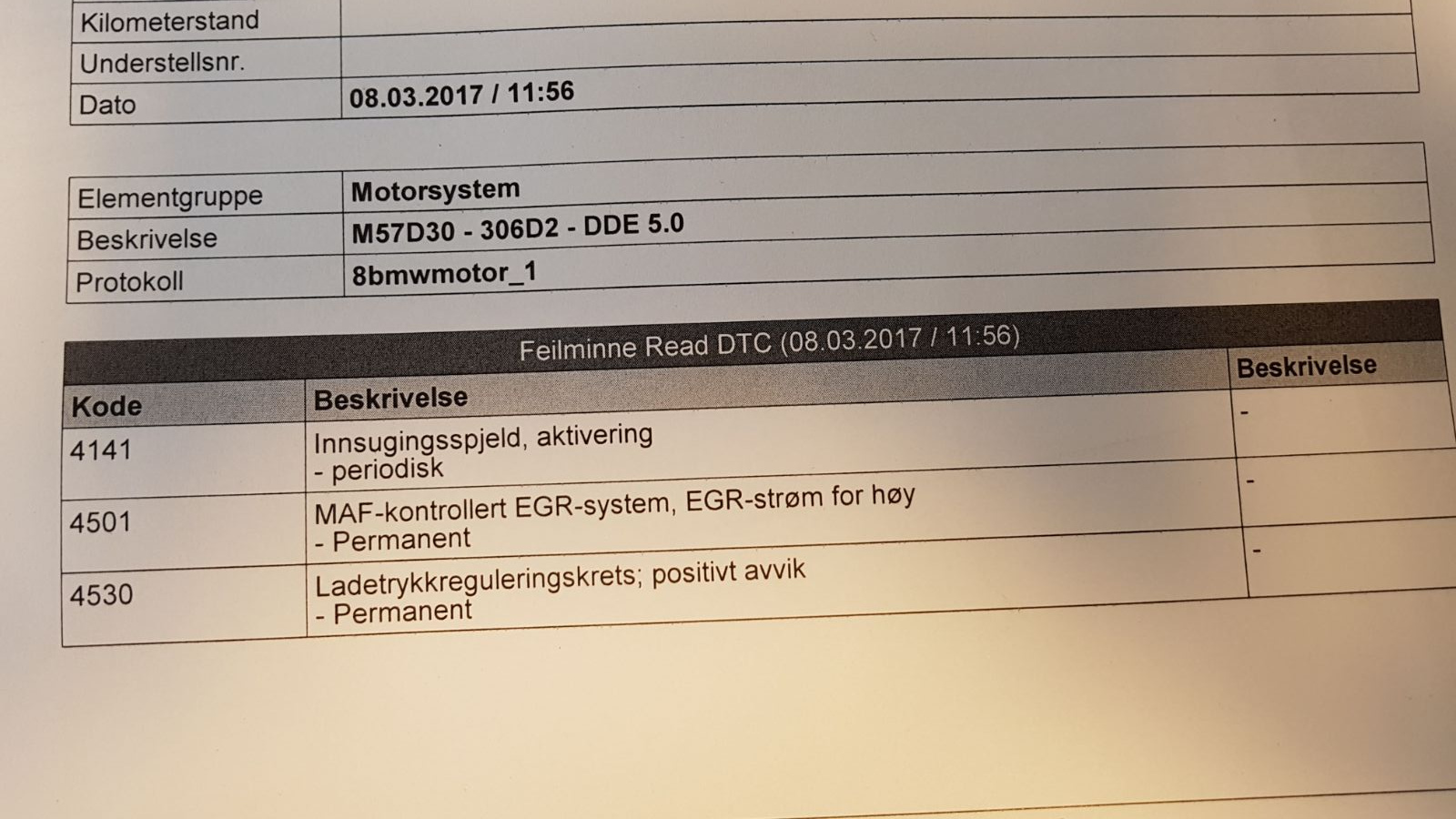 Jeg vil først takke for hjelpen forrige gang! Bilen har vært hos "SweetBmw" i asker og fått lagt inn det jeg håper er riktig sw. Bilen går nå mye bedre, men det er fremdeles et par feilkoder som jeg (mekanikeren som hjelper meg) ikke vet hvorfor er der. Bilen har forøvrig fjernet "swirlflaps" så inntaket er jo derfor ikke "originalt", og dette kan jo ha noe med feilkoder og gjøre.