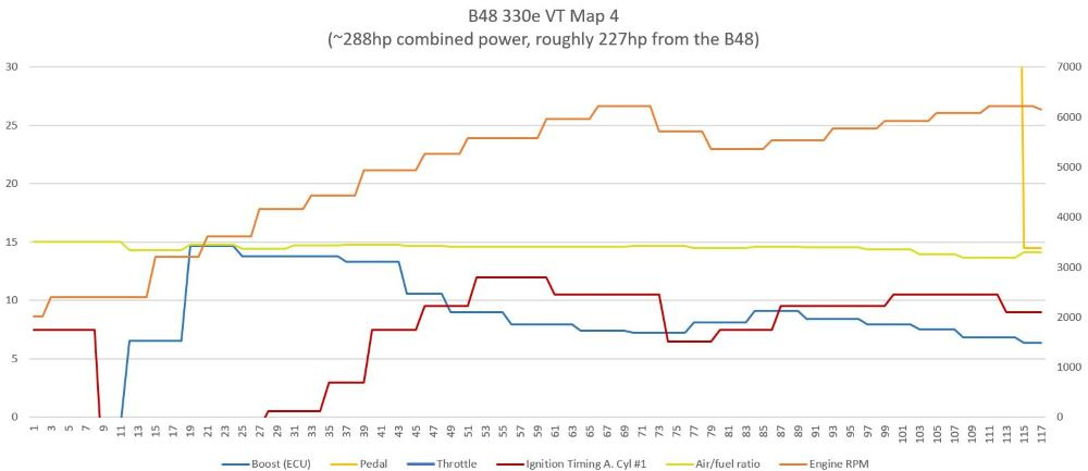 Ja, så det du sier er at det finnes ikke 328i med B48 - det visste jeg vel kanskje egentlig. I mellomtiden har jeg googlet som en helt og fant dette bildet (under), som viser en trimmet 330i. Den har tilnærmet identisk AFR-kurve som meg, muligens noe lavere helt på slutten. Det antyder at også 330i-tune av B48 kjører svært magert fra fabrikk, og han fyren her gjør det med nesten 280hk. Så da virker det innafor å gjøre det på min som jeg til daglig kjører med lavere effekt enn 330i. Ble greit off-topic i denne tråden etterhvert da siden din var en N20-bil, men den er vel solgt så håper du tilgir