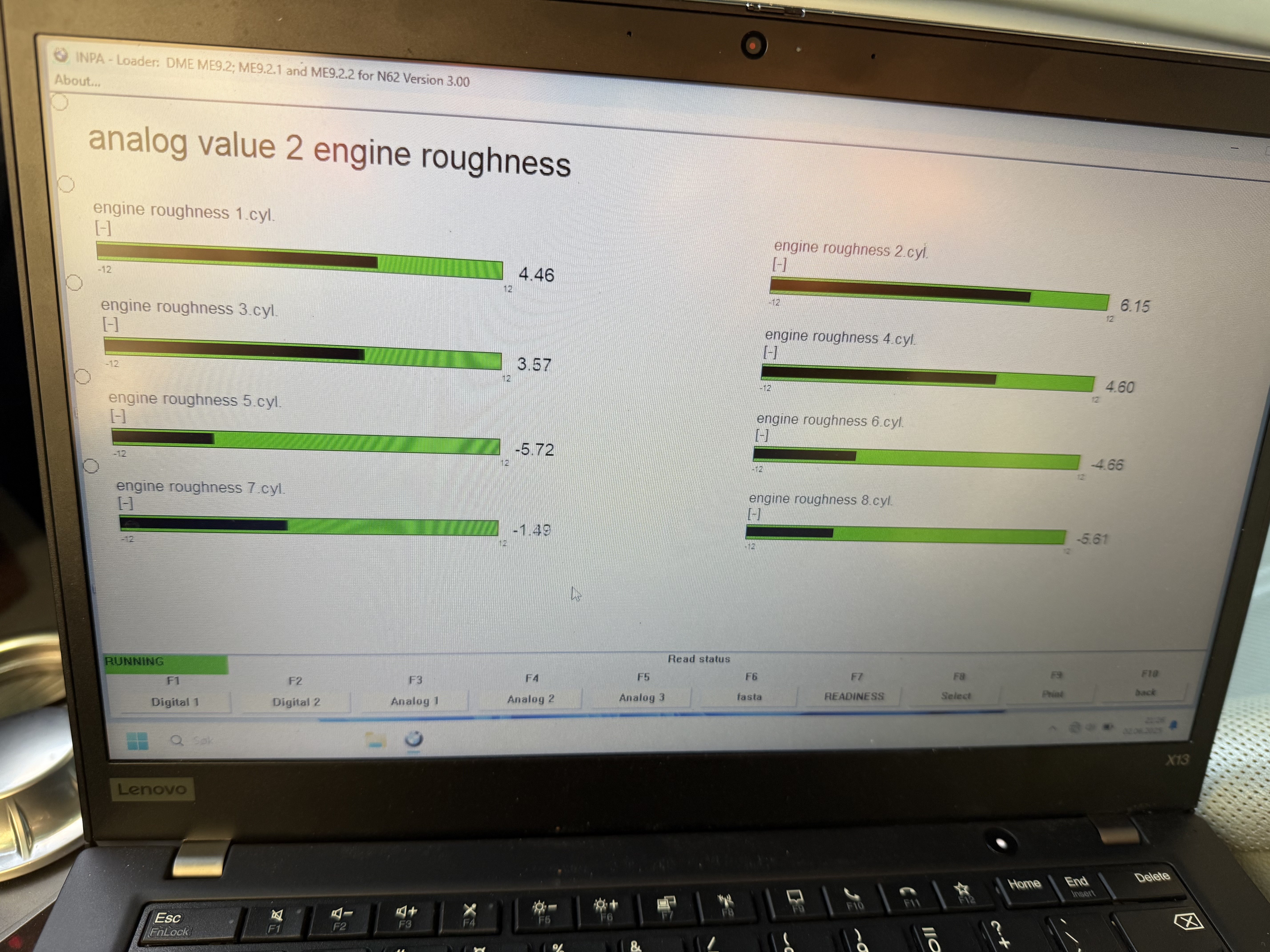 Første start etter ventildekselpakning ble byttet gikk motoren helt OK, litt feiltenning på sylinder 1 og 4 (dette hadde den gjort før ved kaldstart også) og feilkode 2731 - kamakselkontrol inntak.. Virket som at det var litt mindre futt i motoren som tyder på at vanos eller valvetronic ikke var helt happy. Etter dette lot jeg den stå en ukes tid, og når jeg i går skulle starte bilen for å begynne feilsøking ble den veldig tvang. Etter mye hosting fikk jeg til slutt motoren til å gå, da med feiltenning-koder på hele venstre side av motoren (sett forfra), altså sylindere 1 til og med 4. Eneste andre feilkode etter jeg lot motoren gå i 2 minutter var 27BF som er kamakselsensor inntak på bank 2 og 2731 koden kom tilbake igjen Jeg har begynt med litt feilsøking, sjekket først at tennplugger og coiler var montert riktig, deretter koblet jeg ut de fire vanos-magnetventilene for å utelukke vanos, men motoren gikk fremdeles like dårlig. Jeg dobbeltsjekket også at de 4 kamakselsensorene var plugget inn riktig (såvidt jeg skjønner går det ikke an å koble disse feil grunnet kabellengdene). Valvetronic ble demontert og montert slik FCP-euro anbefaler og jeg lot disse "intitialisere" før første start. Har dere noen tips til hva som kan ha gått galt? Rettere sagt neste ting jeg burde feilsøke? Feilkodene hinter jo mot at kamasklene plasserer seg feil, enten grunnet vanos eller valvetronic.. Jeg legger ved bilde av "roughness fanen" fra Inpa mens motoren gikk hvis det er av nytte