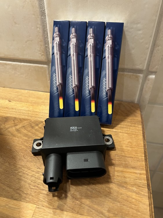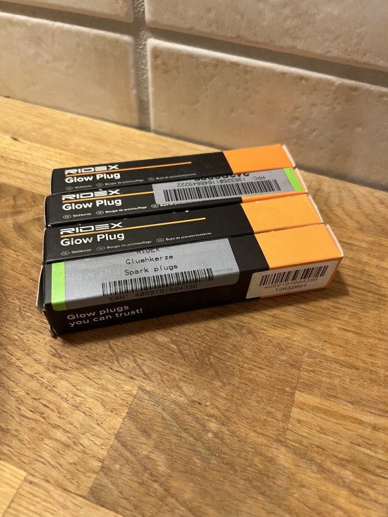 Glødeplugger fra Bosch (OE: 12237786869) og Gløderele fra Hüco (OE: 12217801200) samlet pris 1000 kroner Skikkelig kvalitets-glødeplugger fra Ridex (OE: 12232248059) Selges for 30kr (En hvit monster i brusskapet på jobb)