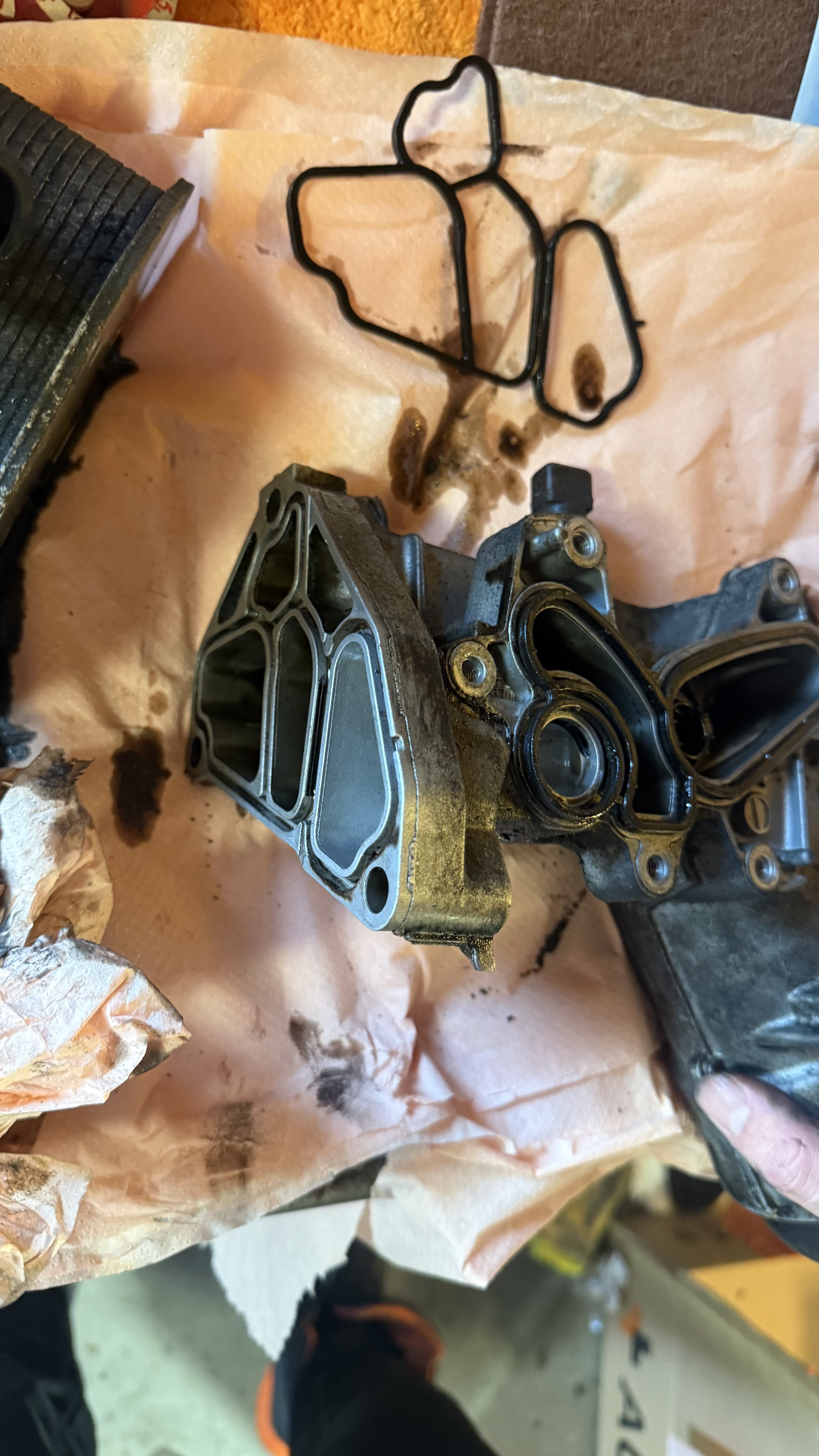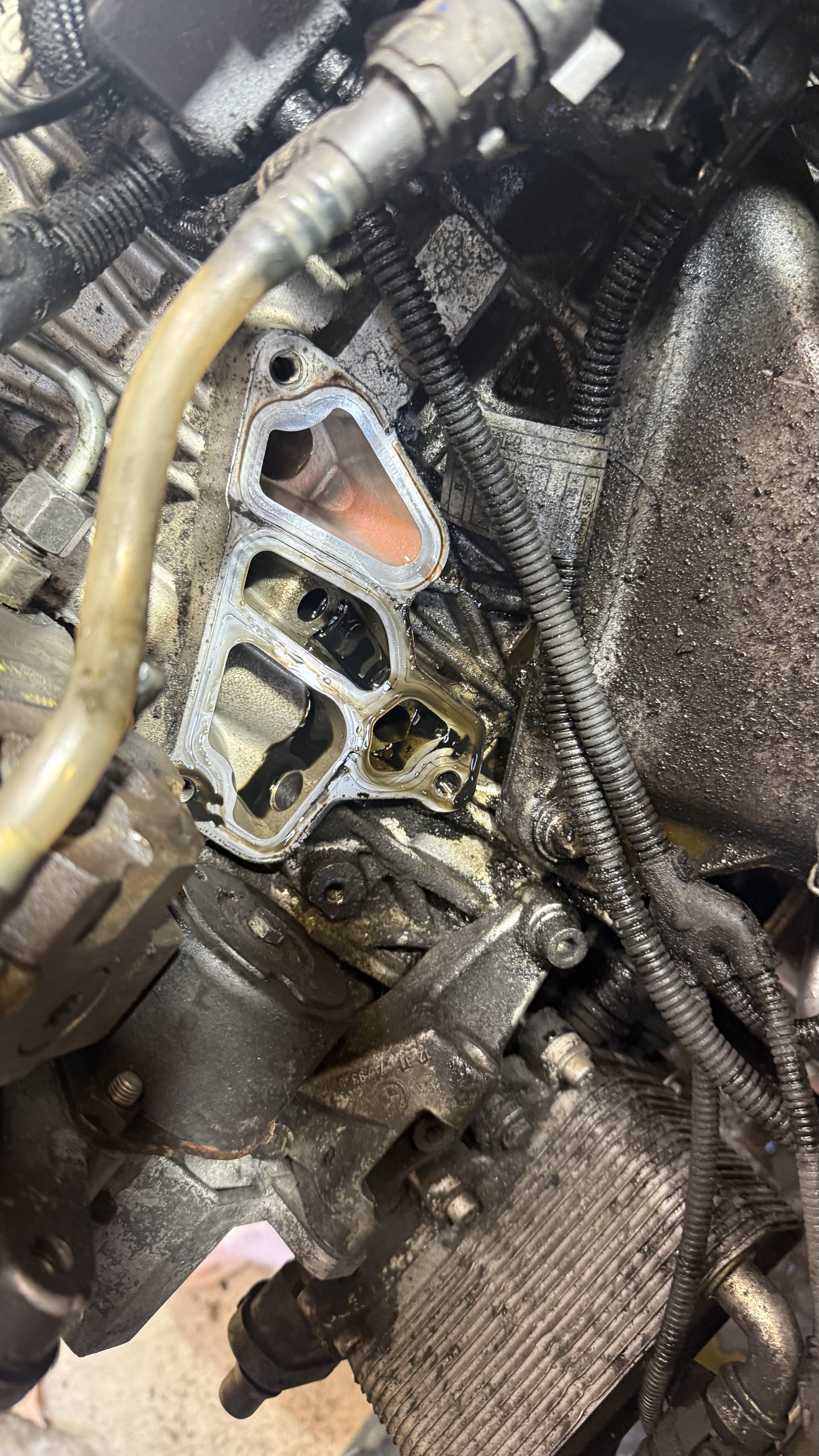 Godt nytt år! Her har det ikke skjedd stort. Det står litt stille i mangel på ubegrensede midler. Men jeg har vært i garasjen idag og fått gjort litt! plukka av oljekjøler for og bytte pakninger. er greit med olje i området, så mistenker at pakningene ikke er helt tette Demontert og rengjort så godt det lot seg gjøre, men gikk tom for bremserens. nye pakninger på plass, org bmw pakninger fra Koed, selvfølgelig. Når jeg var i området så skulle jeg få på plass returrør, og egentlig blir ferdig med alt som er koblet opp mot høytrykkspumpa. men livet skjer innimellom og plastikk knekker. Noen som har liggende det røret mellom torpedovegg og htp? Returrør fra dyser har jeg liggende nytt, så er ikke nøye om det er fra bil med piezo eller solenoide dyser. Må bare være fra M57 med alu blokk, da stålblokk motor har et litt annet oppsett.